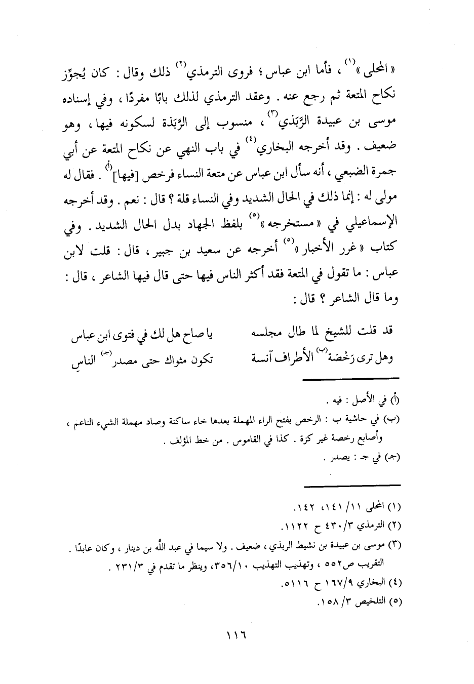 "المحلى" (¬1)، فأما ابن عباس؛ فروى الترمذي (¬2) ذلك وقال: كان يُجوِّز نكاح المتعة ثم رجع عنه. وعقد الترمذي لذلك بابًا مفردًا، وفي إسناده موسى بن عبيدة الرَّبَذي (¬3)، منسوب إلى الرَّبَذة لسكونه فيها، وهو ضعيف. وقد أخرجه البخاري (¬4) في باب النهي عن نكاح المتعة عن أبي جمرة الضبعي، أنه سأل ابن عباس عن متعة النساء فرخص [فيها] (أ). فقال له مولى له: إنما ذلك في الحال الشديد وفي النساء قلة؟ قال: نعم. وقد أخرجه الإسماعيلي في "مستخرجه" (¬5) بلفظ الجهاد بدل الحال الشديد. وفي كتاب "غرر الأخبار" (5) أخرجه عن سعيد بن جبير، قال: قلت لابن عباس: ما تقول في المتعة فقد أكثر الناس فيها حتى قال فيها الشاعر، قال: وما قال الشاعر؟ قال: