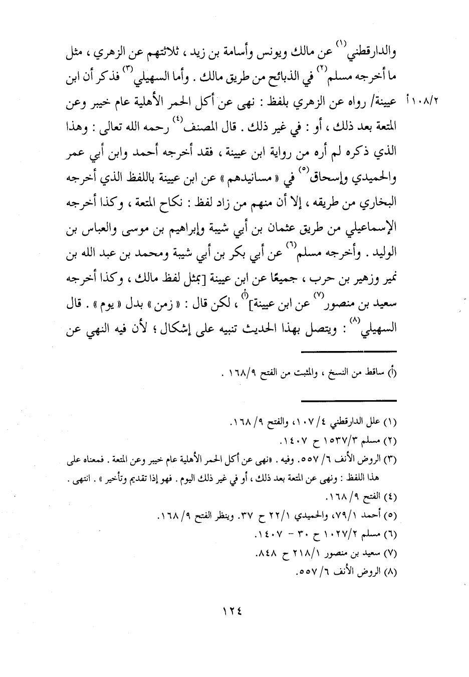 (¬3) الروض الأنف 6/ 557. وفيه. "نهى عن أكل الحمر الأهلية عام خيبر وعن المتعة. فمعناه على هذا اللفظ: ونهى عن المتعة بعد ذلك، أو في غير ذلك اليوم. فهو إذا تقديم وتأخير". انتهى.