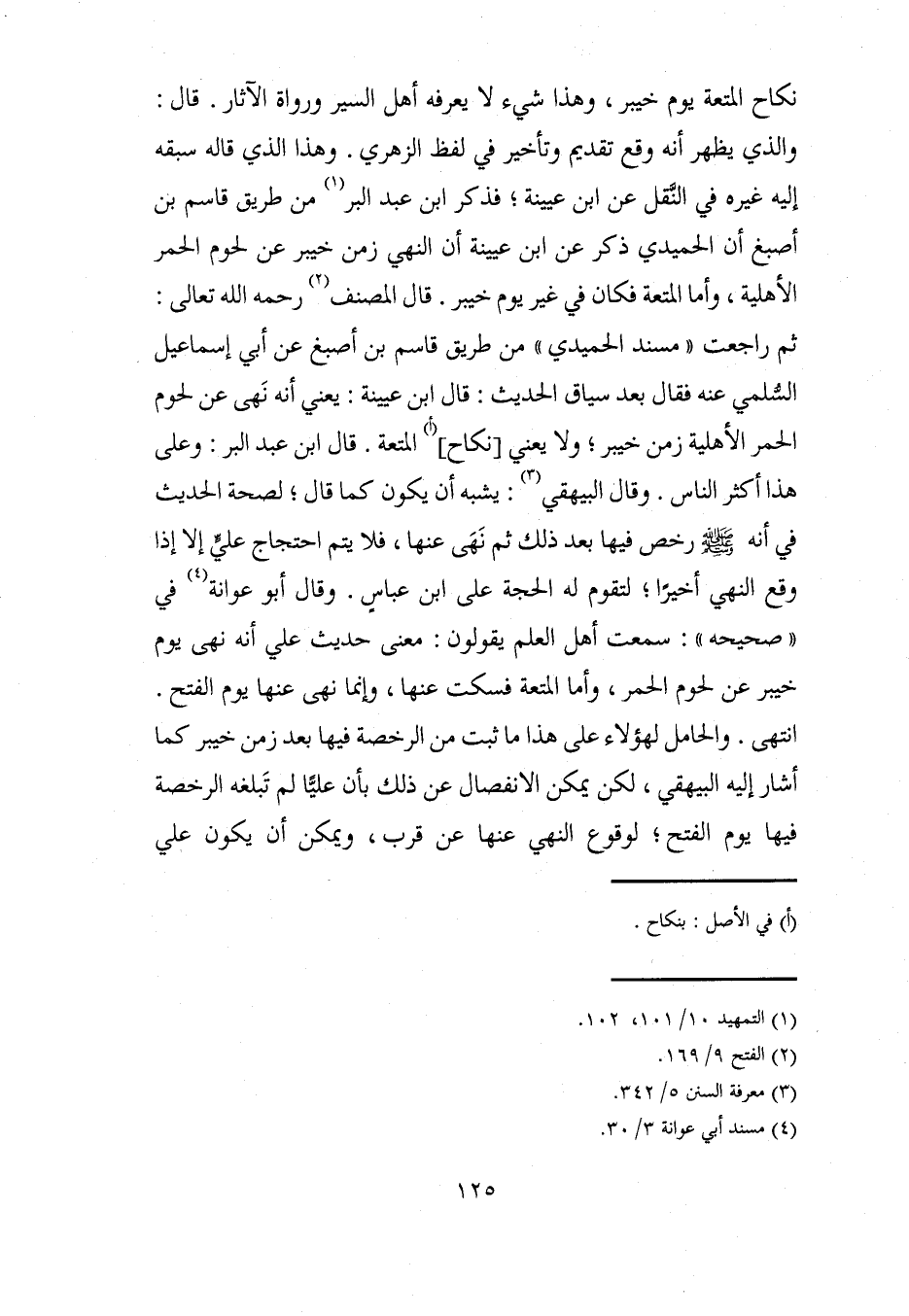 نكاح المتعة يوم خيبر، وهذا شيء لا يعرفه أهل السير ورواة الآثار. قال: والذي يظهر أنه وقع تقديم وتأخير في لفظ الزهري. وهذا الذي قاله سبقه إليه غيره في النَّقل عن ابن عيينة؛ فذكر ابن عبد البر (¬1) من طريق قاسم بن أصبغ أن الحميدي ذكر عن ابن عيينة أن النهي زمن خيبر عن لحوم الحمر الأهلية، وأما المتعة فكان في غير يوم خيبر. قال المصنف (¬2) رحمه الله تعالى: ثم راجعت "مسند الحميدي" من طريق قاسم بن أصبغ عن أبي إسماعيل السُّلمي عنه فقال بعد سياق الحديث: قال ابن عيينة: يعني أنه نَهى عن لحوم الحمر الأهلية زمن خيبر؛ ولا يعني [نكاح] (أ) المتعة. قال ابن عبد البر: وعلى هذا أكثر الناس. وقال البيهقي (¬3): يشبه أن يكون كما قال؛ لصحة الحديث في أنه - صلى الله عليه وسلم - رخص فيها بعد ذلك ثم نَهَى عنها، فلا يتم احتجاج عليٍّ إلا إذا وقع النهي أخيرًا؛ لتقوم له الحجة على ابن عباسٍ. وقال أبو عوانة (¬4) في "صحيحه": سمعت أهل العلم يقولون: معنى حديث علي أنه نهى يوم خيبر عن لحوم الحمر، وأما المتعة فسكت عنها، وإنما نهى عنها يوم الفتح. انتهى. والحامل لهؤلاء على هذا ما ثبت من الرخصة فيها بعد زمن خيبر كما أشار إليه البيهقي، لكن يمكن الانفصال عن ذلك بأن عليًّا لم تَبلغه الرخصة فيها يوم الفتح؛ لوقوع النهي عنها عن قرب، ويمكن أن يكون علي