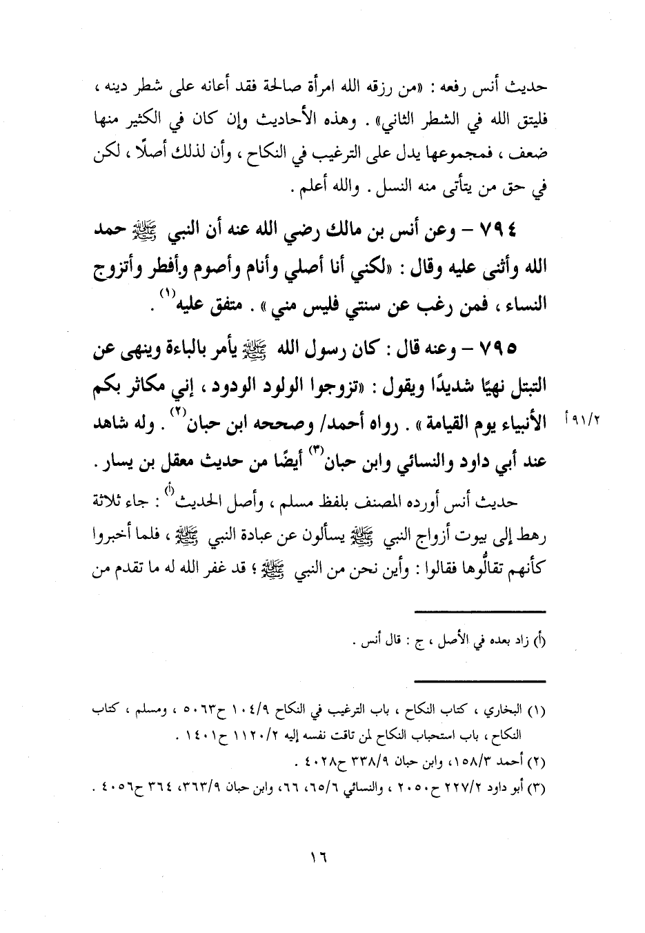 حديث أنس رفعه: "من رزقه الله امرأة صالحة فقد أعانه على شطر دينه، فليتق الله في الشطر الثاني". وهذه الأحاديث وإن كان في الكثير منها ضعف، فمجموعها يدل على الترغيب في النكاح، وأن لذلك أصلًا، لكن في حق من يتأتى منه النسل. والله أعلم.