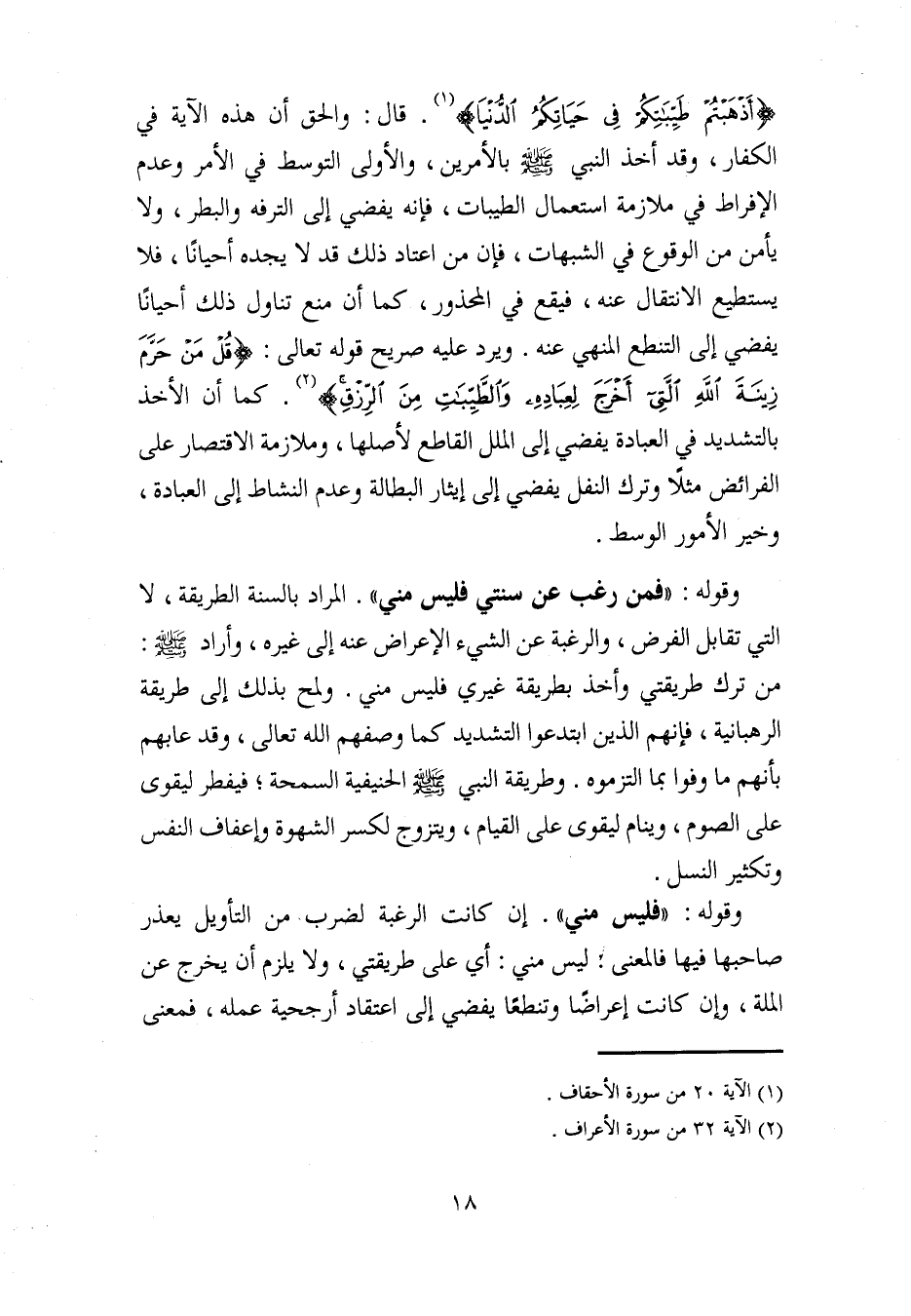 {أَذْهَبْتُمْ طَيِّبَاتِكُمْ فِي حَيَاتِكُمُ الدُّنْيَا} (¬1). قال: والحق أن هذه الآية في الكفار، وقد أخذ النبي - صلى الله عليه وسلم - بالأمرين، والأولى التوسط في الأمر وعدم الإفراط في ملازمة استعمال الطيبات، فإنه يفضي إلى الترفه والبطر، ولا يأمن من الوقوع في الشبهات، فإن من اعتاد ذلك قد لا يجده أحيانًا، فلا يستطيع الانتقال عنه، فيقع في المحذور، كما أن منع تناول ذلك أحيانًا يفضي إلى التنطع المنهي عنه. ويرد عليه صريح قوله تعالى: {قُلْ مَنْ حَرَّمَ زِينَةَ اللَّهِ الَّتِي أَخْرَجَ لِعِبَادِهِ وَالطَّيِّبَاتِ مِنَ الرِّزْقِ} (¬2). كما أن الأخذ بالتشديد في العبادة يفضي إلى الملل القاطع لأصلها، وملازمة الاقتصار على الفرائض مثلًا وترك النفل يفضي إلى إيثار البطالة وعدم النشاط إلى العبادة، وخير الأمور الوسط.