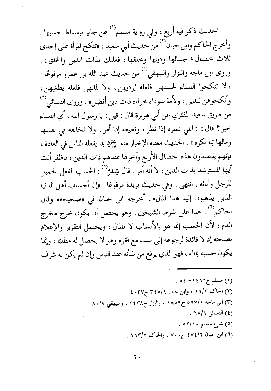 وروى ابن ماجه والبزار والبيهقي (¬3) من حديث عبد الله بن عمرو مرفوعًا: "لا تنكحوا النساء لحسنهن فلعله يُرديهن، ولا لمالهن فلعله يطغيهن، وأنكحوهن للدين، ولأمة سوداء خرقاء ذات دين أفضل". وروى النسائي (¬4) من طريق سعيد المقبُري عن أبي هريرة قال: قيل: يا رسول الله، أي النساء خير؟ قال: "التي تسره إذا نظر، وتطعه إذا أمر، ولا تخالفه في نفسها ومالها بما يكره". الحديث معناه الإخبار منه - صلى الله عليه وسلم - بما يفعله الناس في العادة، فإنهم يقصدون هذه الخصال الأربع وآخرها عندهم ذات الدين، فاظفر أنت أيها المسترشد بذات الدين، لا أنه أمر. قال شِفرٌ (¬5): الحسب الفعل الجميل للرجل وآبائه. انتهى. وفي حديث بريدة مرفوعًا: "إن أحساب أهل الدنيا الذين يذهبون إليه هذا المال". أخرجه ابن حبان في "صحيحه" وقال الحاكم (¬6): هذا على شرط الشيخين. وهو يحتمل أن يكون خرج مخرج الذم، لأن الحسب إنما هو بالأنساب لا بالمال، ويحتمل التقرير والإعلام بصحته إذ لا فائدة لرجوعه إلى نسبه مع فقره وهو لا يحصل له مطلبًا، وإنما يكون حسبه بماله، فهو الذي يرفع من شأنه عند الناس كان لم يكن له شرف