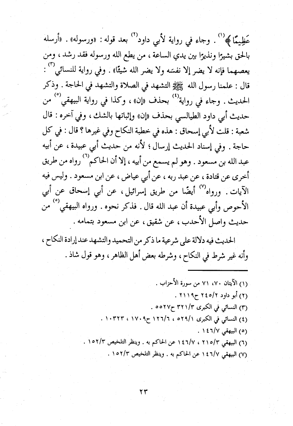 عَظِيمًا} (¬1). وجاء في رواية لأبي داود (¬2) بعد قوله: "ورسوله". "أرسله بالحق بشيرًا ونذيرًا بين يدي الساعة، من يطع الله ورسوله فقد رشد، ومن يعصهما فإنه لا يضر إلا نفسَه ولا يضر الله شيئًا". وفي رواية للنسائي (¬3): قال: علمنا رسول الله - صلى الله عليه وسلم - التشهد في الصلاة والتشهد في الحاجة. وذكر الحديث. وجاء في رواية (¬4) بحذف "إن"، وكذا في رواية البيهقي (¬5) من حديث أبي داود الطيالسي بحذف "إن" وإثباتها بالشك، وفي آخره: قال شعبة: قلت لأبي إسحاق: هذه في خطبة النكاح وفي غيرها؟ قال: في كل حاجة. وفي إسناد الحديث إرسال؛ لأنه من حديث أبي عبيدة، عن أبيه عبد الله بن مسعود. وهو لم يسمع من أبيه، إلا أن الحاكم (¬6) رواه من طريق أخرى عن قتادة، عن عبد ربه، عن أبي عياض، عن ابن مسعود. وليس فيه الآيات. ورواه (¬7) أيضًا من طريق إسرائيل، عن أبي إسحاق عن أبي الأحوص وأبي عبيدة أن عبد الله قال. فذكر نحوه. ورواه البيهقي (5) من حديث واصل الأحدب، عن شقيق، عن ابن مسعود بتمامه.