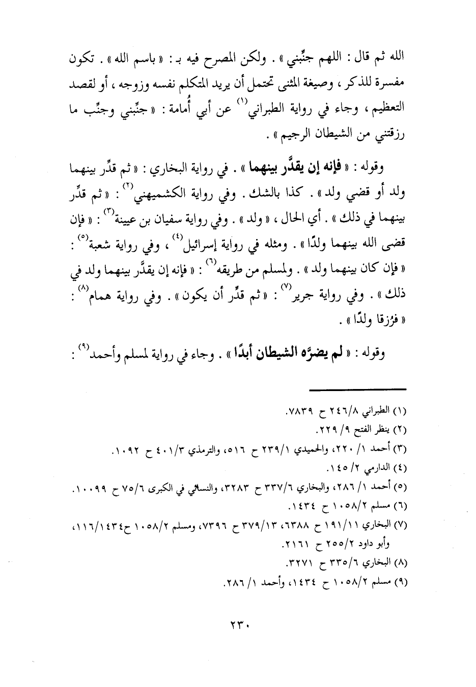 الله ثم قال: اللهم جنِّبني". ولكن المصرح فيه بـ: "باسم الله". تكون مفسرة للذكر، وصيغة المثنى تحتمل أن يريد المتكلم نفسه وزوجه، أو لقصد التعظيم، وجاء في رواية الطبراني (¬1) عن أبي أُمامة: "جنِّبني وجنِّب ما رزقتني من الشيطان الرجيم".