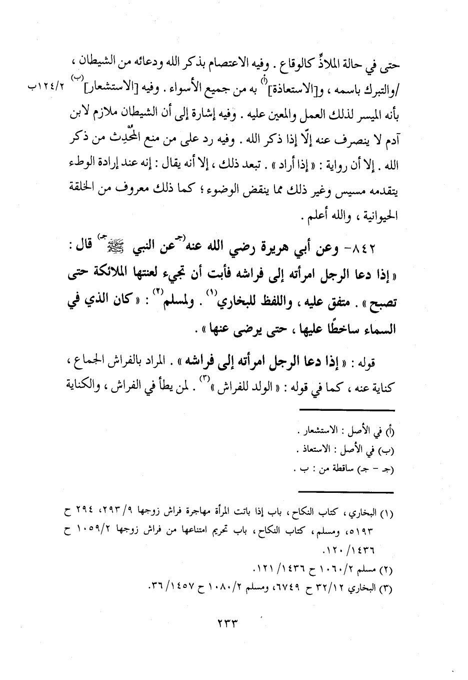 (¬1) البخاري، كتاب النكاح، باب إذا باتت المرأة مهاجرة فراش زوجها 9/ 293، 294 ح 5193، ومسلم، كتاب النكاح، باب تحريم امتناعها من فراش زوجها 2/ 1059 ح 1436/ 120.