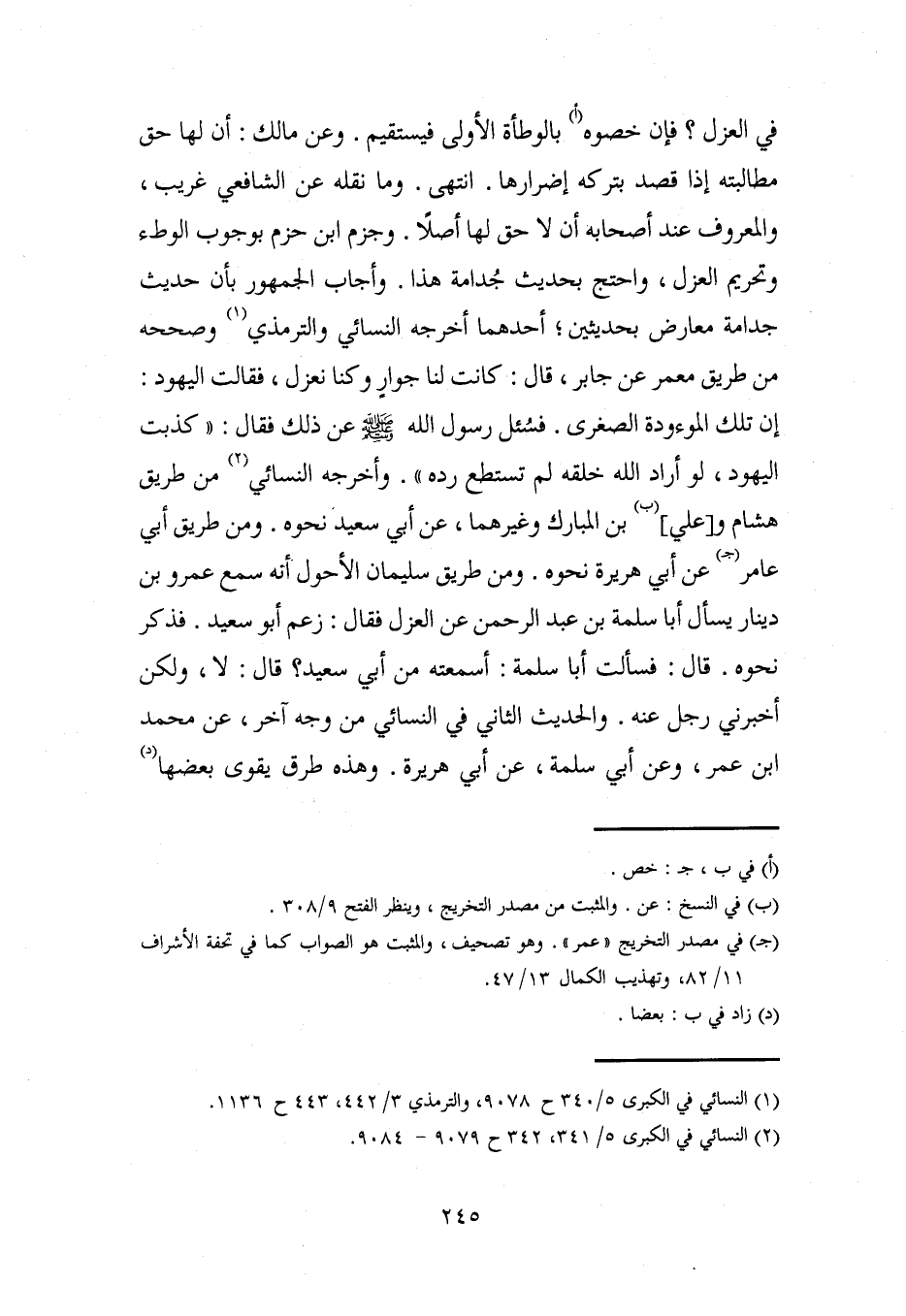 في العزل؟ فإن خصوه (أ) بالوطأة الأولى فيستقيم. وعن مالك: أن لها حق مطالبته إذا قصد بتركه إضرارها. انتهى. وما نقله عن الشافعي غريب، والمعروف عند أصحابة أن لا حق لها أصلًا. وجزم ابن حزم بوجوب الوطء وتحريم العزل، واحتج بحديث جُدامة هذا. وأجاب الجمهور بأن حديث جدامة معارض بحديثين؛ أحدهما أخرجه النسائي والترمذي (¬1) وصححه من طريق معمر عن جابر، قال: كانت لنا جوارٍ وكنا نعزل، فقالت اليهود: إن تلك الموءودة الصغرى. فسُئل رسول الله - صلى الله عليه وسلم - عن ذلك فقال: "كذبت اليهود، لو أراد الله خلقه لم تستطع رده". وأخرجه النسائي (¬2) من طريق هشام و [علي] (ب) بن المبارك وغيرهما، عن أبي سعيد نحوه. ومن طريق أبي عامر (جـ) عن أبي هريرة نحوه. ومن طريق سليمان الأحول أنه سمع عمرو بن دينار يسأل أبا سلمة بن عبد الرحمن عن العزل فقال: زعم أبو سعيد. فذكر نحوه. قال: فسألت أبا سلمة: أسمعته من أبي سعيد؟ قال: لا، ولكن أخبرني رجل عنه. والحديث الثاني في النسائي من وجه آخر، عن محمد بن عمر، وعن أبي سلمة، عن أبي هريرة. وهذه طرق يقوى بعضها (د)