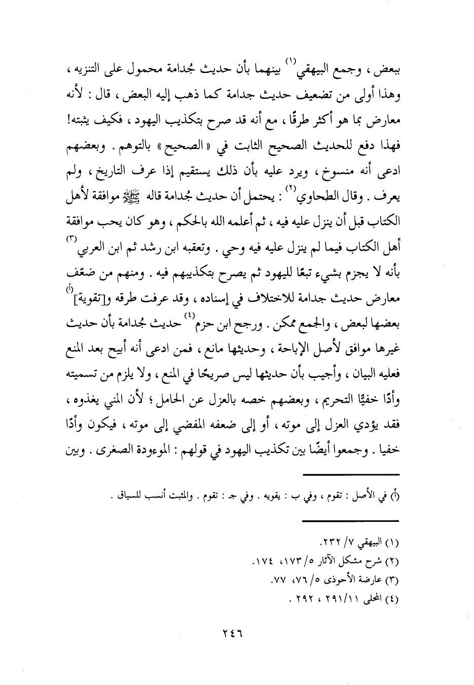ببعض، وجمع البيهقي (¬1) بينهما بأن حديث جُدامة محمول على التنزيه، وهذا أولى من تضعيف حديث جدامة كما ذهب إليه البعض، قال: لأنه معارض بما هو أكثر طرقًا، مع أنه قد صرح بتكذيب اليهود، فكيف يثبته! فهذا دفع للحديث الصحيح الثابت في "الصحيح" بالتوهم. وبعضهم ادعى أنه منسوخ، ويرد عليه بأن ذلك يستقيم إذا عرف التاريخ، ولم يعرف. وقال الطحاوي (¬2): يحتمل أن حديث جُدامة قاله - صلى الله عليه وسلم - موافقة لأهل الكتاب قبل أن ينزل عليه فيه، ثم أعلمه الله بالحكم، وهو كان يحب موافقة أهل الكتاب فيما لم ينزل عليه فيه وحي. وتعقبه ابن رشد ثم ابن العربي (¬3) بأنه لا يجزم بشيء تبعًا لليهود ثم يصرح بتكذيبهم فيه. ومنهم من ضعّف معارض حديث جدامة للاختلاف في إسناده، وقد عرفت طرقه و [تقوية] (أ) بعضها لبعض، والجمع ممكن. ورجح ابن حزم (¬4) حديث جُدامة بأن حديث غيرها موافق لأصل الإباحة، وحديثها مانع، فمن ادعى أنه أبيح بعد المنع فعليه البيان، وأجيب بأن حديثها ليس صريحًا في المنع، ولا يلزم من تسميته وأدًا خفيًّا التحريم، وبعضهم خصه بالعزل عن الحامل؟ لأن المني يغذوه، فقد يؤدي العزل إلى موته، أو إلى ضعفه المفضي إلى موته، فيكون وأدًا خفيا. وجمعوا أيضًا بين تكذيب اليهود في قولهم: الموءودة الصغرى. وبين