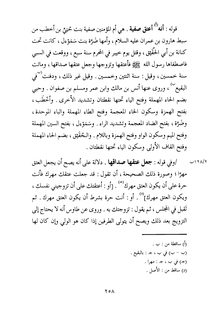 قوله: أنس (أ) أعتق صفية. هي أم المؤمنين صفية بنت حُيّيِّ بن أخطب من سبط هارون بن عمران - عليه السلام -، وأمها ضَرَّة بنت سَمَوْءل، كانت تحت كنانة بن أبي الحُقَيْق، وقتل يوم خيبر في المحرم سنن سبع، ووقعت في السبي فاصطفاها رسول الله - صلى الله عليه وسلم - فأعتقها وتزوجها وجعل عتقها صداقها، وماتت سنة خمسين، وقيل: سنة اثنتين وخمسين. وقيل غير ذلك، ودفنت (ب في البقيع ب)، وروى عنها أنس بن مالك وابن عمر ومسلم بن صفوان. وحيي بضم الحاء المهملة وفتح الياء تحتها نقطتان وتشديد الأخرى. وأخْطَب، بفتح الهمزة وسكون الخاء المعجمة وفتح الطاء المهملة والباء الموحدة، وضَرَّة، بفتح الضاد المعجمة وتشديد الراء. وسَمَوْءل، بفتح السين المهملة وفتح الميم وسكون الواو وفتح الهمزة وباللام. والحُقَيْق، بضم الحاء المهملة وفتح القاف الأولى وسكون الياء تحتها نقطتان.