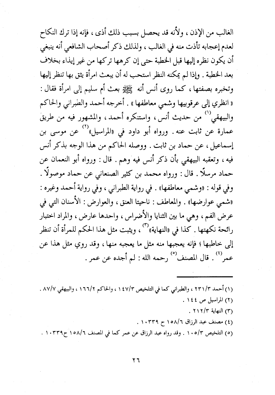 الغالب من الإذن، ولأنه قد يحصل بسبب ذلك أذى، فإنه إذا ترك النكاح لعدم إعجابه تأذت منه في الغالب، ولذلك ذكر أصحاب الشافعي أنه ينبغي أن يكون نظره إليها قبل الخطبة حتى إن كرهها تركها من غير إيذاء بخلاف بعد الخطبة. وإذا لم يمكنه النظر استحب له أن يبعث امرأة يثق بها تنظر إليها وتخبره بصفتها، كما روى أنس أنه - صلى الله عليه وسلم - بعث أم سليم إلى امرأة فقال: "انظري إلى عرقوبيها وشمي معاطفها". أخرجه أحمد والطبراني والحاكم والبيهقي (¬1) من حديث أنس، واستنكره أحمد، والمشهور فيه من طريق عمارة عن ثابت عنه. ورواه أبو داود في "المراسيل" (¬2) عن موسى بن إسماعيل، عن حماد بن ثابت. ووصله الحاكم من هذا الوجه بذكر أنس فيه، وتعقبه البيهقي بأن ذكر أنس فيه وهم. قال: ورواه أبو النعمان عن حماد مرسلًا. قال: ورواه محمد بن كثير الصنعاني عن حماد موصولًا. وفي قوله: "وشمي معاطفها". في رواية الطبراني، وفي رواية أحمد وغيره: "شمي عوارضها". والمعاطف: ناحيتا العنق، والعوارض: الأسنان التي في عرض الفم، وهي ما بين الثنايا والأضراس، واحدها عارض، والمراد اختبار رائحة نكهتها. كذا في "النهاية" (¬3)، ويثبت مثل هذا الحكم للمرأة أن تنظر إلى خاطبها؛ فإنه يعجبها منه مثل ما يعجبه منها، وقد روي مثل هذا عن عمر (¬4). قال المصنف (¬5) رحمه الله: لم أجده عن عمر.