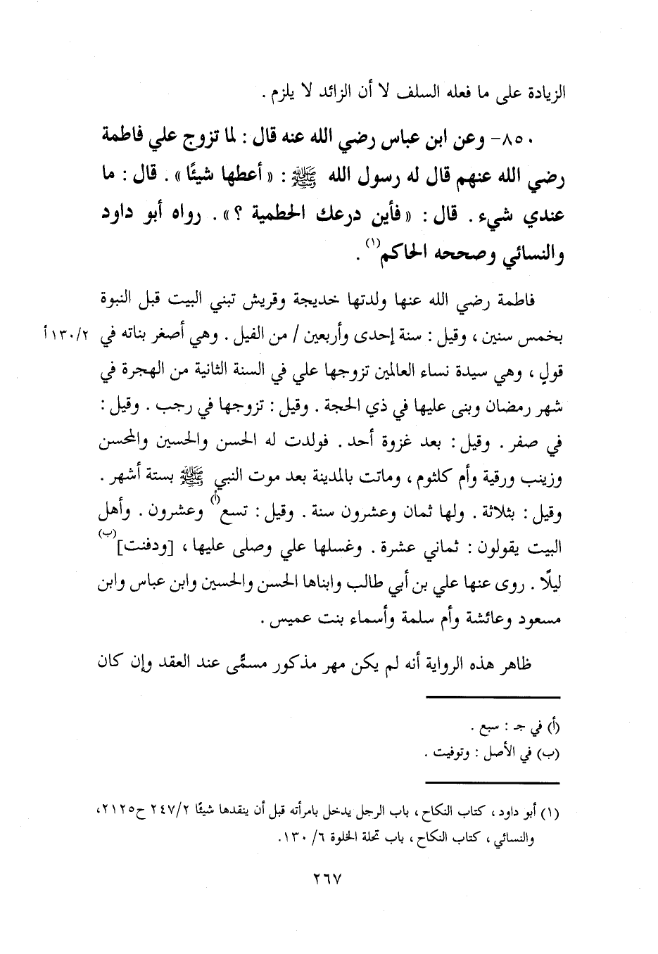 850 - وعن ابن عباس رضي الله عنه قال: لما تزوج علي فاطمة رضي الله عنهم قال له رسول الله - صلى الله عليه وسلم -: "أعطها شيئًا". قال: ما عندي شيء. قال: "فأين درعك الحطمية؟ ". رواه أبو داود والنسائي وصححه الحاكم (¬1).