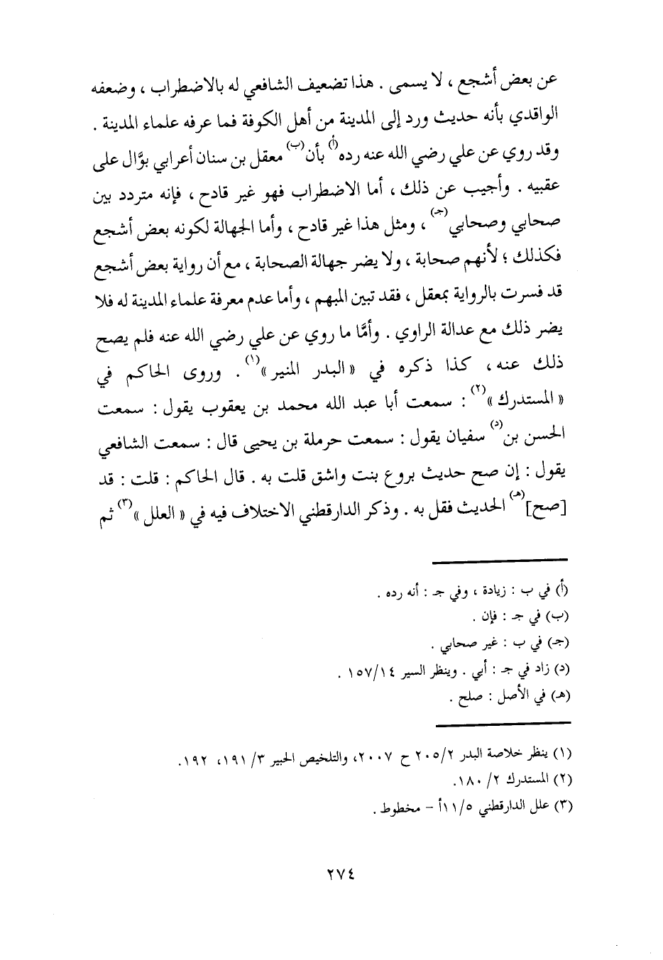 عن بعض أشجع، لا يسمى. هذا تضعيف الشافعي له بالاضطراب، وضعفه الواقدي بأنه حديث ورد إلى المدينة من أهل الكوفة فما عرفه علماء المدينة. وقد روي عن علي رضي الله عنه رده (أ) بأن (ب) معقل بن سنان أعرابي بوَّال على عقبيه. وأجيب عن ذلك، أما الاضطراب فهو غير قادح، فإنه متردد بين صحابي وصحابي (جـ)، ومثل هذا غير قادح، وأما الجهالة لكونه بعض أشجع فكذلك؛ لأنهم صحابة، ولا يضر جهالة الصحابة، مع أن رواية بعض أشجع قد فسرت بالرواية بمعقل، فقد تبين المبهم، وأما عدم معرفة علماء المدينة له فلا يضر ذلك مع عدالة الراوي. وأمَّا ما روي عن علي رضي الله عنه فلم يصح ذلك عنه، كذا ذكره في "البدر المنير" (¬1). وروى الحاكم في "المستدرك" (¬2): سمعت أبا عبد الله محمد بن يعقوب يقول: سمعت الحسن بن (د) سفيان يقول: سمعت حرملة بن يحيى قال: سمعت الشافعي يقول: إن صح حديث بروع بنت واشق قلت به. قال الحاكم: قلت: قد [صح] (هـ) الحديث فقل به. وذكر الدارقطني الاختلاف فيه في "العلل" (¬3) ثم