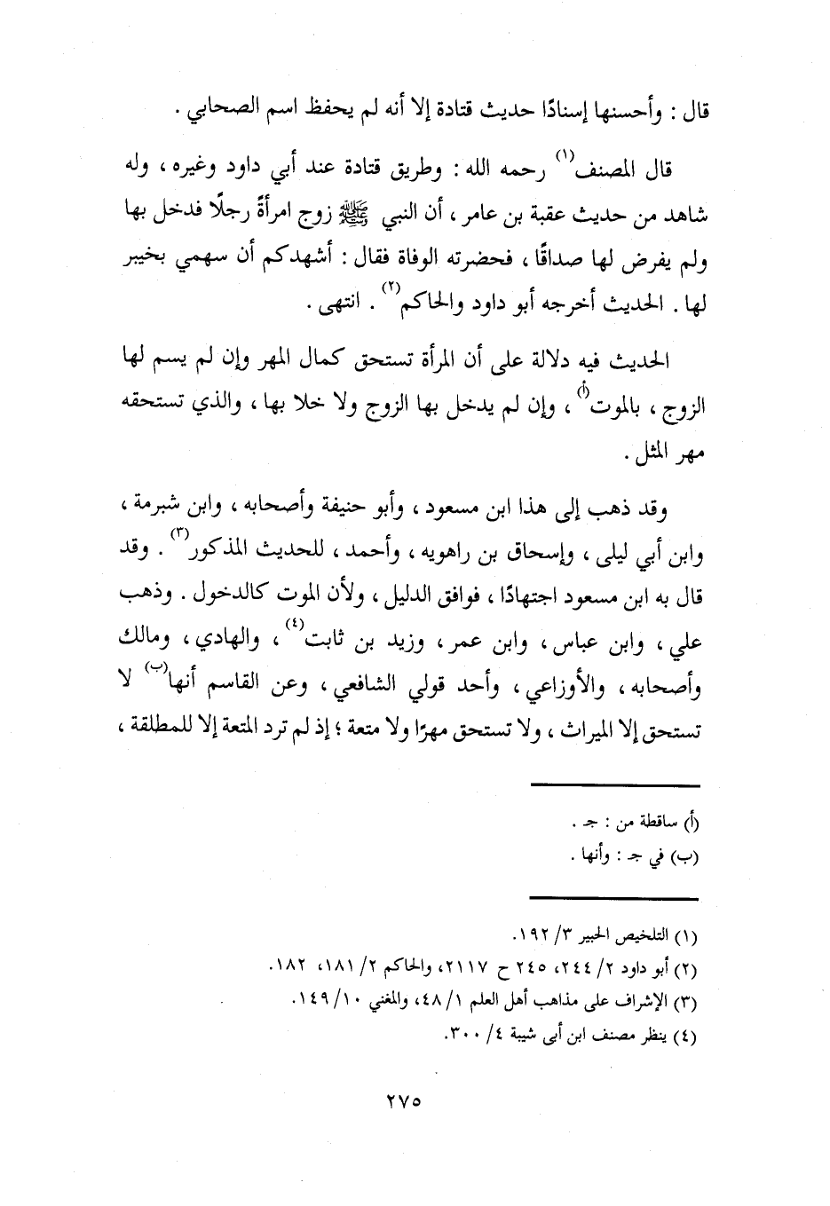 قال المصنف (¬1) رحمه الله: وطريق قتادة عند أبي داود وغيره، وله شاهد من حديث عقبة بن عامر، أن النبي - صلى الله عليه وسلم - زوج امرأةً رجلًا فدخل بها ولم يفرض لها صداقًا، فحضرته الوفاة فقال: أشهدكم أن سهمي بخيبر لها. الحديث أخرجه أبو داود والحاكم (¬2). انتهى.