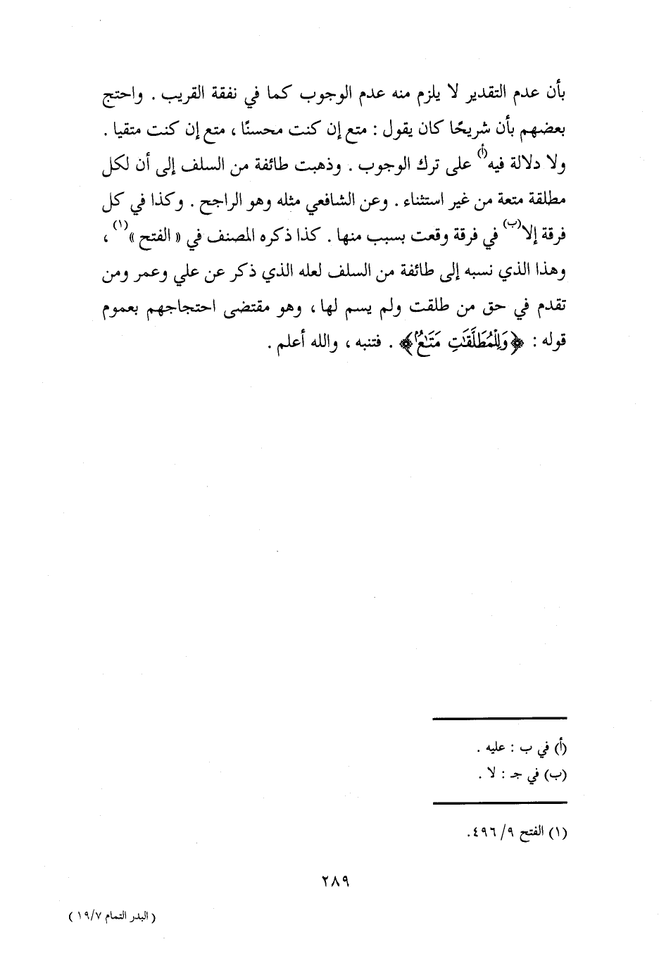 بأن عدم التقدير لا يلزم منه عدم الوجوب كما في نفقة القريب. واحتج بعضهم بأن شريحًا كان يقول: متع إن كنت محسنًا، متع إن كنت متقيا. ولا دلالة فيه (أ) على ترك الوجوب. وذهبت طائفة من السلف إلى أن لكل مطلقة متعة من غير استثناء. وعن الشافعي مثله وهو الراجح. وكذا في كل فرقة إلا (ب) في فرقة وقعت بسبب منها. كذا ذكره المصنف في "الفتح" (¬1)، وهذا الذي نسبه إلى طائفة من السلف لعله الذي ذكر عن علي وعمر ومن تقدم في حق من طلقت ولم يسم لها، وهو مقتضى احتجاجهم بعموم قوله: {وَلِلْمُطَلَّقَاتِ مَتَاعٌ}. فتنبه، والله أعلم.
