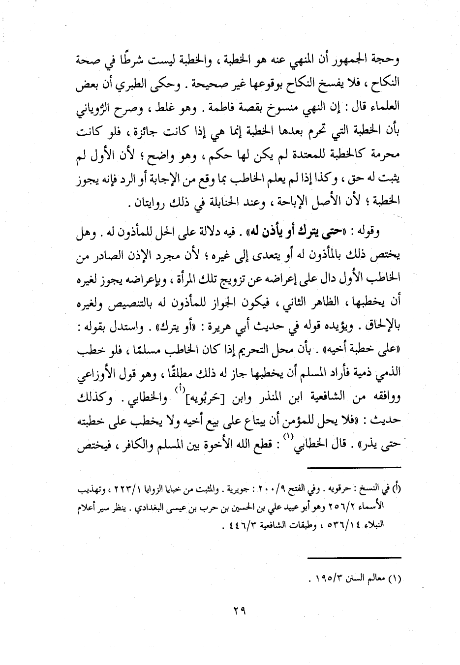 وقوله: "حتى يترك أو يأذن له". فيه دلالة على الحل للمأذون له. وهل يختص ذلك بالمأذون له أو يتعدى إلى غيره؛ لأن مجرد الإذن المصادر من الخاطب الأول دال على إعراضه عن تزويج تلك المرأة، وبإعراضه يجوز لغيره أن يخطبها، الظاهر الثاني، فيكون الجواز للمأذون له بالتنصيص ولغيره بالإلحاق. ويؤيده قوله في حديث أبي هريرة: "أو يترك". واستدل بقوله: "على خطبة أخيه". بأن محل التحريم إذا كان الخاطب مسلمًا، فلو خطب الذمي ذمية فأراد المسلم أن يخطبها جاز له ذلك مطلقًا، وهو قول الأوزاعي ووافقه من الشافعية ابن المنذر وابن [حَربُويه] (أ) والخطابي. وكذلك حديث: "فلا يحل للمؤمن أن يبتاع على بيع أخيه ولا يخطب على خطبته حتى يذر". قال الخطابي (¬1): قطع الله الأخوة بين المسلم والكافر، فيختص