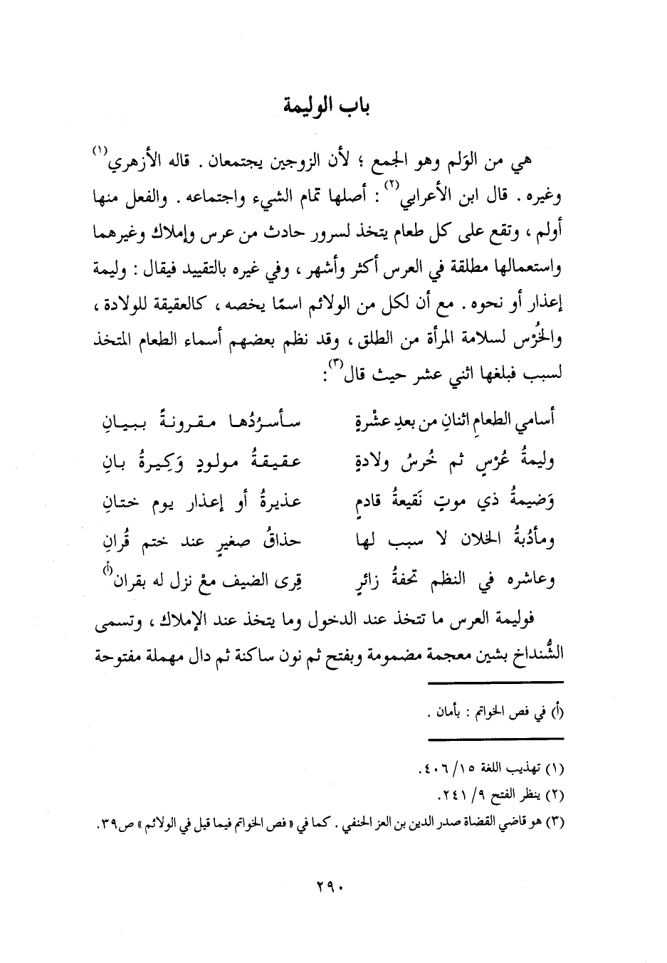 هي من الوَلم وهو الجمع؛ لأن الزوجين يجتمعان. قاله الأزهري (¬1) وغيره. قال ابن الأعرابي (¬2): أصلها تمام الشيء واجتماعه. والفعل منها أولم، وتقع على كل طعام يتخذ لسرور حادث من عرس وإملاك وغيرهما واستعمالها مطلقة في العرس أكثر وأشهر، وفي غيره بالتقييد فيقال: وليمة إعذار أو نحوه. مع أن لكل من الولائم اسمًا يخصه، كالعقيقة للولادة، والخُرْس لسلامة المرأة من الطلق، وقد نظم بعضهم أسماء الطعام المتخذ لسبب فبلغها اثني عشر حيث قال (¬3):