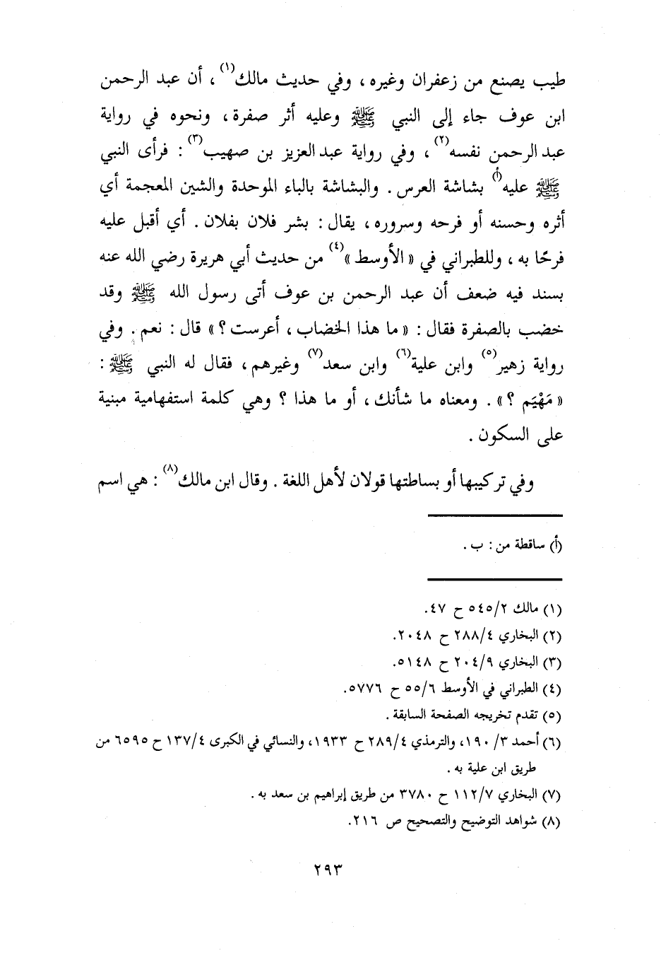 طيب يصنع من زعفران وغيره، وفي حديث مالك (¬1)، أن عبد الرحمن بن عوف جاء إلى النبي - صلى الله عليه وسلم - وعليه أثر صفرة، ونحوه في رواية عبد الرحمن نفسه (¬2)، وفي رواية عبد العزيز بن صهيب (¬3): فرأى النبي - صلى الله عليه وسلم - عليه (أ) بشاشة العرس. والبشاشة بالباء الموحدة والشين المعجمة أي أثره وحسنه أو فرحه وسروره، يقال: بشر فلان بفلان. أي أقبل عليه فرحًا به، وللطبراني في "الأوسط" (¬4) من حديث أبي هريرة رضي الله عنه بسند فيه ضعف أن عبد الرحمن بن عوف أتى رسول الله - صلى الله عليه وسلم - وقد خضب بالصفرة فقال: "ما هذا الخضاب، أعرست؟ " قال: نعم. وفي رواية زهير (¬5) وابن علية (¬6) وابن سعد (¬7) وغيرهم، فقال له النبي - صلى الله عليه وسلم -: "مَهْيَم؟ ". ومعناه ما شأنك، أو ما هذا؟ وهي كلمة استفهامية مبنية على السكون.