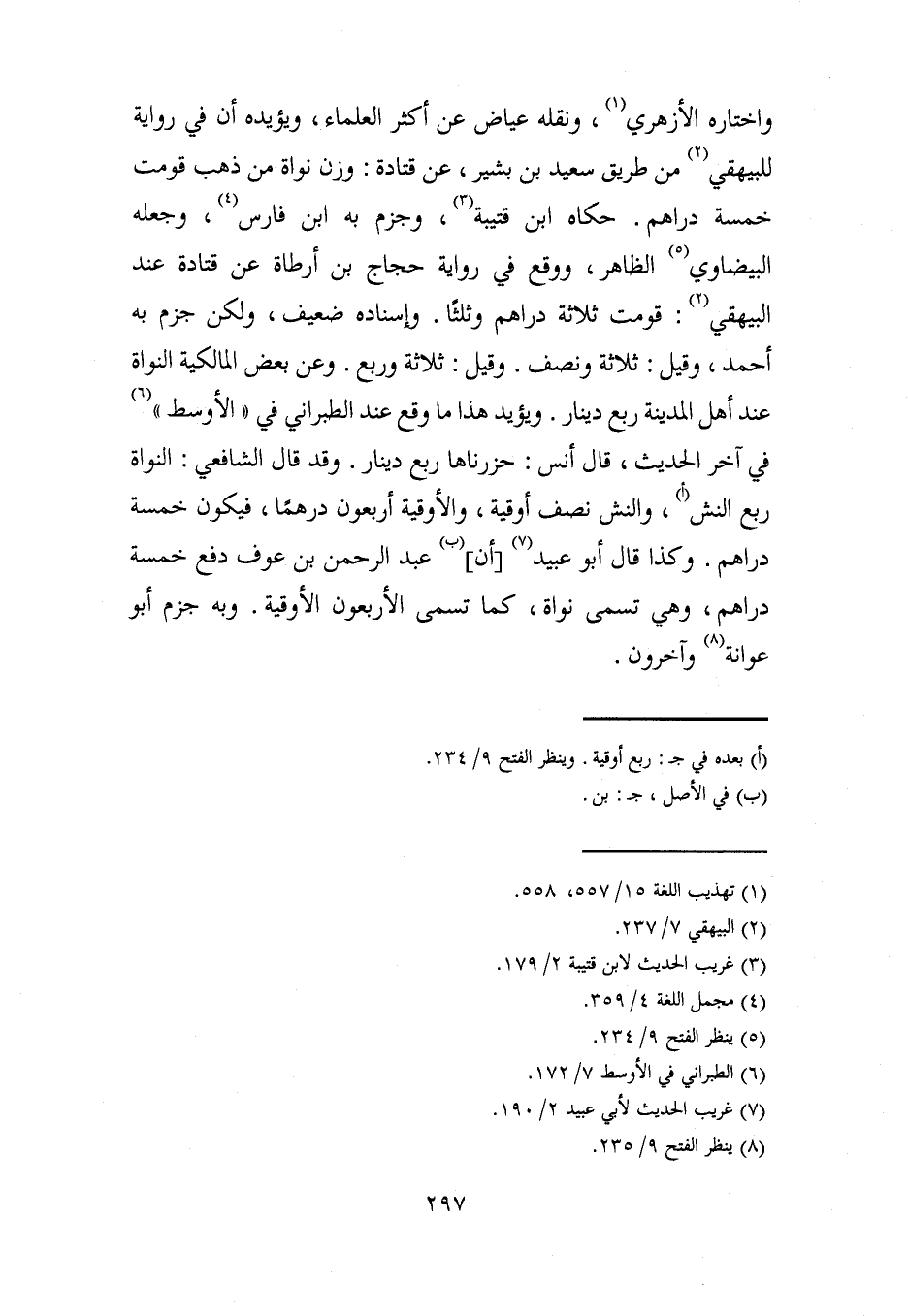 واختاره الأزهري (¬1)، ونقله عياض عن أكثر العلماء، ويؤيده أن في رواية للبيهقي (¬2) من طريق سعيد بن بشير، عن قتادة: وزنا نواة من ذهب قومت خمسة دراهم. حكاه ابن قتيبة (¬3)، وجزم به ابن فارس (¬4)، وجعله البيضاوي (¬5) الظاهر، ووقع في رواية حجاج بن أرطاة عن قتادة عند البيهقي (2): قومت ثلاثة دراهم وثلثًا. وإسناده ضعيف، ولكن جزم به أحمد، وقيل: ثلاثة ونصف. وقيل: ثلاثة وربع. وعن بعض المالكية النواة عند أهل المدينة ربع دينار. ويؤيد هذا ما وقع عند الطبراني في "الأوسط" (¬6) في آخر الحديث، قال أنس: حزرناها ربع دينار. وقد قال الشافعي: النواة ربع النش (أ)، والنش نصف أوقية، والأوقية أربعون درهمًا، فيكون خمسة دراهم. وكذا قال أبو عبيد (¬7) [أن] (ب) عبد الرحمن بن عوف دفع خمسة دراهم، وهي تسمى نواة، كما تسمى الأربعون الأوقية. وبه جزم أبو عوانة (¬8) وآخرون.