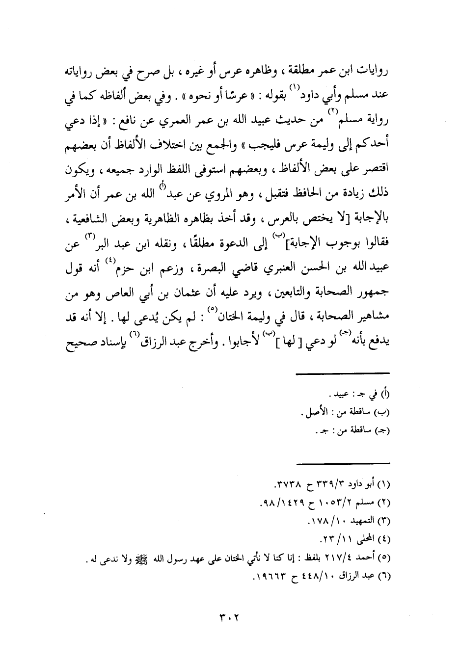 روايات ابن عمر مطلقة، وظاهره عرس أو غيره، بل صرح في بعض رواياته عند مسلم وأبي داود (¬1) بقوله: "عرسًا أو نحوه". وفي بعض ألفاظه كما في رواية مسلم (¬2) من حديث عبيد الله بن عمر العمري عن نافع: "إذا دعي أحدكم إلى وليمة عرس فليجب" والجمع بين اختلاف الألفاظ أن بعضهم اقتصر على بعض الألفاظ، وبعضهم استوفى اللفظ الوارد جميعه، ويكون ذلك زيادة من الحافظ فتقبل، وهو المروي عن عبد (أ) الله بن عمر أن الأمر بالإجابة [لا يختص بالعرس، وقد أخذ بظاهره الظاهرية وبعض الشافعية، فقالوا بوجوب الإجابة] (ب) إلى الدعوة مطلقًا، ونقله ابن عبد البر (¬3) عن عبيد الله بن الحسن العنبري قاضي البصرة، وزعم ابن حزم (¬4) أنه قول جمهور الصحابة والتابعين، ويرد عليه أن عثمان بن أبي العاص وهو من مشاهير الصحابة، قال في وليمة الختان (¬5): لم يكن يُدعى لها. إلا أنه قد يدفع بأنه (جـ) لو دعي [لها] (ب) لأجابوا. وأخرج عبد الرزاق (¬6) بإسناد صحيح