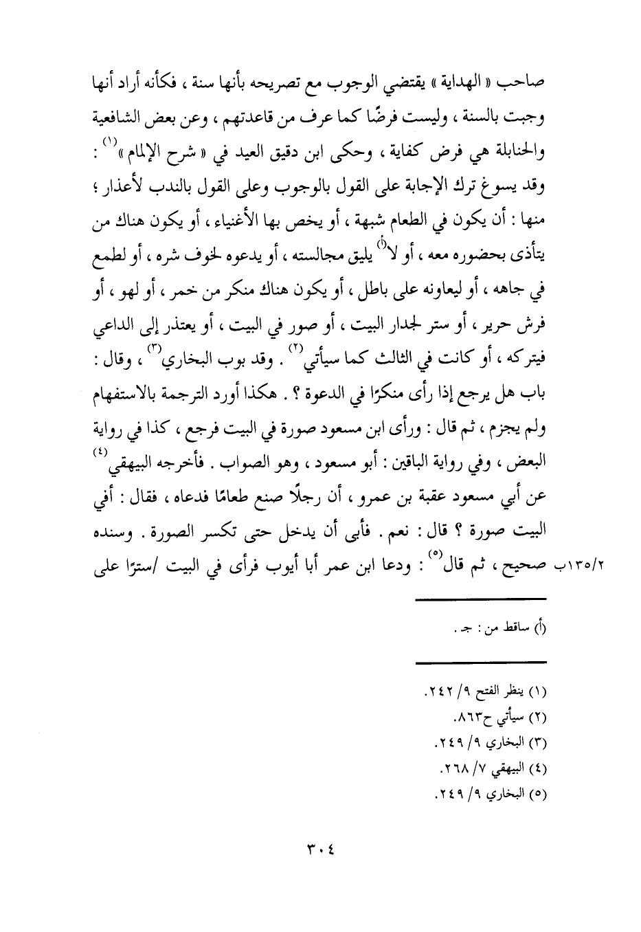 صاحب "الهداية" يقتضي الوجوب مع تصريحه بأنها سنة، فكأنه أراد أنها وجبت بالسنة، وليست فرضًا كما عرف من قاعدتهم، وعن بعض الشافعية والحنابلة هي فرض كفاية، وحكى ابن دقيق العيد في "شرح الإلمام" (¬1): وقد يسوغ ترك الإجابة على القول بالوجوب وعلى القول بالندب لأعذار، منها: أن يكون في الطعام شبهة، أو يخص بها الأغنياء، أو يكون هناك من يتأذى بحضوره معه، أو لا (أ) يليق مجالسته، أو يدعوه لخوف شره، أو لطمع في جاهه، أو ليعاونه على باطل، أو يكون هناك منكر من خمر، أو لهو، أو فرش حرير، أو ستر لجدار البيت، أو صور في البيت، أو يعتذر إلى الداعي فيتركه، أو كانت في الثالث كما سيأتي (¬2). وقد بوب البخاري (¬3)، وقال: باب هل يرجع إذا رأى منكرًا في الدعوة؟. هكذا أورد الترجمة بالاستفهام ولم يجزم، ثم قال: ورأى ابن مسعود سورة في البيت فرجع، كذا في رواية البعض، وفي رواية الباقين: أبو مسعود، وهو الصواب. فأخرجه البيهقي (¬4) عن أبي مسعود عقبة بن عمرو، أن رجلًا صنع طعامًا فدعاه، فقال: أفي البيت صورة؟ قال: نعم. فأبى أن يدخل حتى تكسر الصورة. وسنده صحيح، ثم قال (¬5): ودعا ابن عمر أبا أيوب فرأى في البيت سترًا على