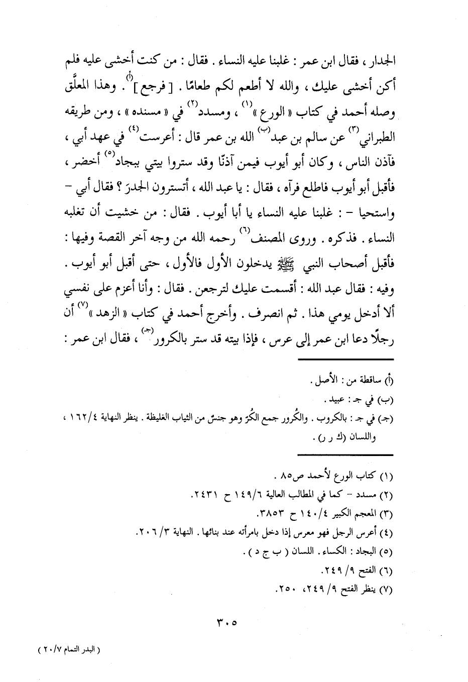 الجدار، فقال ابن عمر: غلبنا عليه النساء. فقال: من كنت أخشى عليه فلم أكن أخشى عليك، والله لا أطعم لكم طعامًا. [فرجع] (أ). وهذا المعلَّق وصله أحمد في كتاب "الورع" (¬1)، ومسدد (¬2) في "مسنده"، ومن طريقه الطبراني (¬3) عن سالم بن عبد (ب) الله بن عمر قال: أعرست (¬4) في عهد أبي، فآذن الناس، وكان أبو أيوب فيمن آذنّا وقد ستروا بيتي ببجاد (¬5) أخضر، فأقبل أبو أيوب فاطلع فرآه، فقال: يا عبد الله، أتسترون الجدرَ؟ فقال أبي -واستحيا-: غلبنا عليه النساء يا أبا أيوب. فقال: من خشيت أن تغلبه النساء. فذكره. وروى المصنف (¬6) رحمه الله من وجه آخر القصة وفيها: فأقبل أصحاب النبي - صلى الله عليه وسلم - يدخلون الأول فالأول، حتى أقبل أبو أيوب. وفيه: فقال عبد الله: أقسمت عليك لترجعن. فقال؛ وأنا أعزم على نفسي ألا أدخل يومي هذا. ثم انصرف. وأخرج أحمد في كتاب "الزهد" (¬7) أن رجلًا دعا ابن عمر إلى عرس، فإذا بيته قد ستر بالكرور (جـ)، فقال ابن عمر: