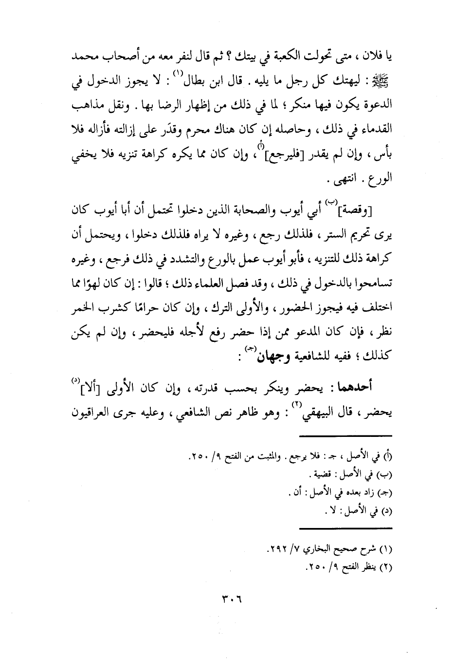 [وقصة] (ب) أبي أيوب والصحابة الذين دخلوا تحتمل أن أبا أيوب كان يرى تحريم الستر، فلذلك رجع، وغيره لا يراه فلذلك دخلوا، ويحتمل أن كراهة ذلك للتنزيه، فأبو أيوب عمل بالورع والتشدد في ذلك فرجع، وغيره تسامحوا بالدخول في ذلك، وقد فصل العلماء ذلك؛ قالوا: إن كان لهوًا مما اختلف فيه فيجوز الحضور، والأولى الترك، وإن كان حرامًا كشرب الخمر نظر، فإن كان المدعو ممن إذا حضر رفع لأجله فليحضر، وإن لم يكن كذلك؛ ففيه للشافعية وجهان (جـ):