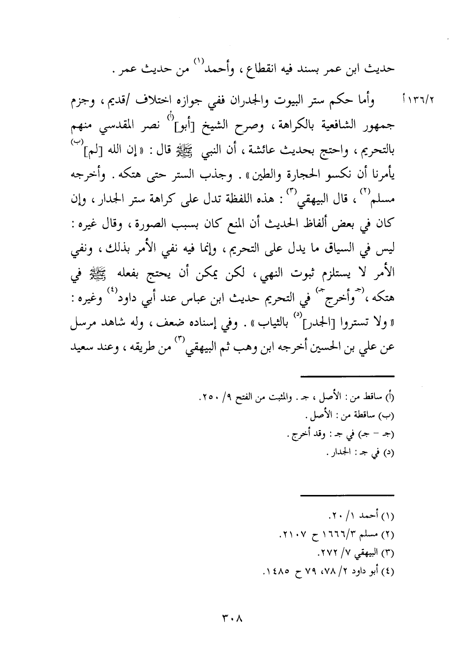 وأما حكم ستر البيوت والجدران ففي جوازه اختلاف قديم، وجزم جمهور الشافعية بالكراهة، وصرح الشيخ [أبو] (أ) نصر المقدسي منهم بالتحريم، واحتج بحديث عائشة، أن النبي - صلى الله عليه وسلم - قال: "إن الله [لم] (ب) يأمرنا أن نكسو الحجارة والطين". وجذب الستر حتى هتكه. وأخرجه مسلم (¬2)، قال البيهقي (¬3): هذه اللفظة تدل على كراهة ستر الجدار، وإن كان في بعض ألفاظ الحديث أن المنع كان بسبب الصورة، وقال غيره: ليس في السياق ما يدل على التحريم، وإنما فيه نفي الأمر بذلك، ونفي الأمر لا يستلزم ثبوت النهي، لكن يمكن أن يحتج بفعله - صلى الله عليه وسلم - في هتكه، (جـ وأخرج جـ) في التحريم حديث ابن عباس عند أبي داود (¬4) وغيره: "ولا تستروا [الجدر] (د) بالثياب". وفي إسناده ضعف، وله شاهد مرسل عن علي بن الحسين أخرجه ابن وهب ثم البيهقي (3) من طريقه، وعند سعيد