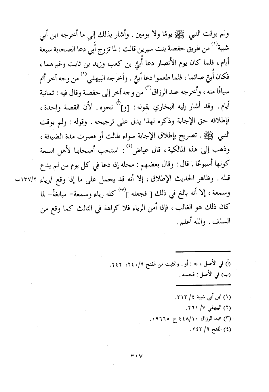 ولم يوقت النبي - صلى الله عليه وسلم - يومًا ولا يومين. وأشار بذلك إلى ما أخرجه ابن أبي شيبة (¬1) من طريق حفصة بنت سيرين قالت: لما تزوج أَبِي دعا الصحابة سبعة أيام، فلما كان يوم الأنصار دعا أُبيَّ بن كعب وزيد بن ثابت وغيرهما، فكان أُبيُّ صائما، فلما طعموا دعا أبيّ. وأخرجه البيهقي (¬2) من وجه آخر أتم سياقًا منه، وأخرجه عبد الرزاق (¬3) من وجه آخر إلى حفصة وقال فيه: ثمانية أيام. وقد أشار إليه البخاري بقوله: [و] (أً) نحوه. لأن القصة واحدة، فإطلاقه حق الإجابة وذكره لهذا يدل على ترجيحه. وقوله: ولم يوقت النبي - صلى الله عليه وسلم -. تصريح بإطلاق الإجابة سواء طالت أو قصرت مدة الضيافة، وذهب إلى هذا المالكية، قال عياض (¬4): استحب أصحابنا لأهل السعة كونها أسبوعًا. قال: وقال بعضهم: محله إذا دعا في كل يوم من لم يدع قبله. وظاهر الحديث الإطلاق، إلا أنه قد يحمل على ما إذا وقع رياء وسمعة، إلا أنه بالغ في ذلك [فجعله] (ب) كله رياء وسمعة -مبالغةً- لما كان ذلك هو الغالب، فإذا أمن الرياء فلا كراهة في الثالث كما وقع من السلف. والله أعلم.