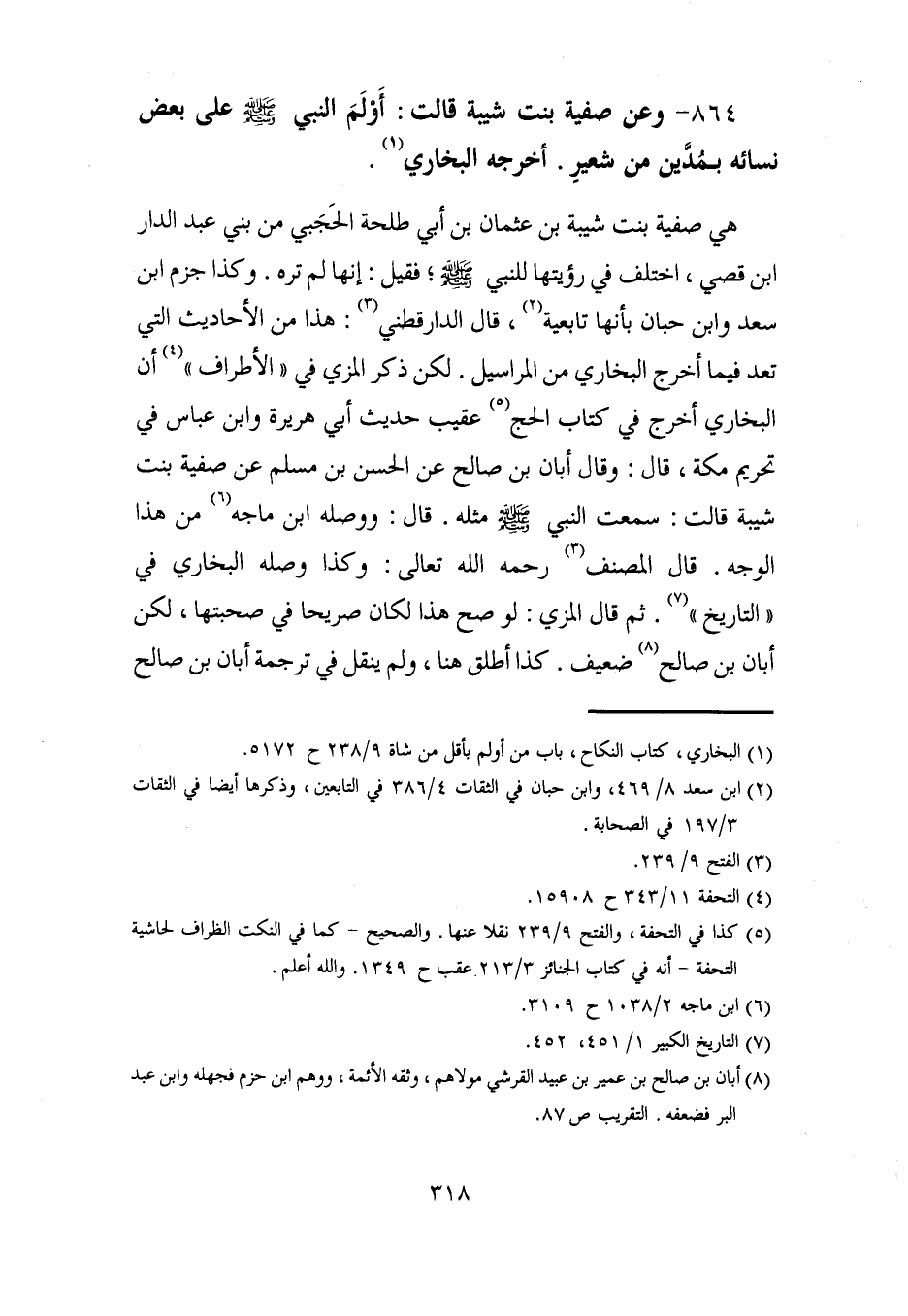 864 - وعن صفية بنت شيبة قالت: أَوْلَمَ النبي - صلى الله عليه وسلم - على بعض نسائه بمُدَّين من شعيرٍ. أخرجه البخاري (¬1).