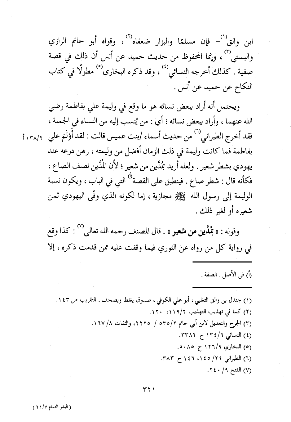 ويحتمل أنه أراد ببعض نسائه هو ما وقع في وليمة علي بفاطمة رضي الله عنهما، وأراد ببعض نسائه؛ أي: من يُنسب إليه من النساء في الجملة، فقد أخرج الطبراني (¬6) من حديث أسماء بنت عميعر قالت: لقد أَوْلَمَ علي بفاطمة فما كانت وليمة في ذلك الزمان أفضل من وليمته، رهن درعه عند يهودي بشطر شعير. ولعله أريد بمُدَّين من شعير؛ لأن المدين نصف الصاع، فكأنه قال: شطر صاع. فينطبق على القصة (أ) التي في الباب، ويكون نسبة الوليمة إلى رسول الله - صلى الله عليه وسلم - مجازية، إما لكونه الذي وفّى اليهودي ثمن شعيره أو لغير ذلك.