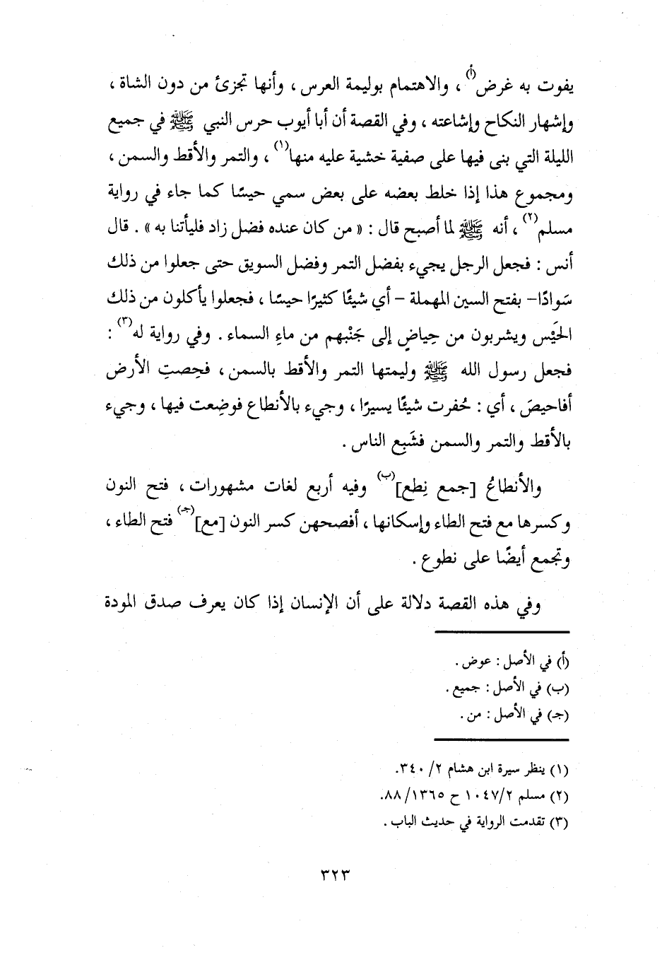 يفوت به غرض (أ)، والاهتمام بوليمة العرس، وأنها تجزئ من دون الشاة، وإشهار النكاح وإشاعته، وفي القصة أن أبا أيوب حرس النبي - صلى الله عليه وسلم - في جميع الليلة التي بنى فيها على صفية خشية عليه منها (¬1)، والتمر والأقط والسمن، ومجموع هذا إذا خلط بعضه على بعض سمي حيسًا كما جاء في رواية مسلم (¬2)، أنه - صلى الله عليه وسلم - لما أصبح قال: "من كان عنده فضل زاد فليأتنا به". قال أنس: فجعل الرجل يجيء بفضل التمر وفضل السويق حتى جعلوا من ذلك سَوادًا -بفتح السين المهملة- أي شيئًا كثيرًا حيسًا، فجعلوا يأكلون من ذلك الحيْس ويشربون من حِياضٍ إلى جَنْبهم من ماءِ السماء. وفي رواية له (¬3): فجعل رسول الله - صلى الله عليه وسلم - وليمتها التمر والأقط بالسمن، فحِصتِ الأرض أفاحيصَ، أي: حُفرت شيئًا يسيرًا، وجيء بالأنطاع فوضِعت فيها، وجيء بالأقط والتمر والسمن فشَبع الناس.