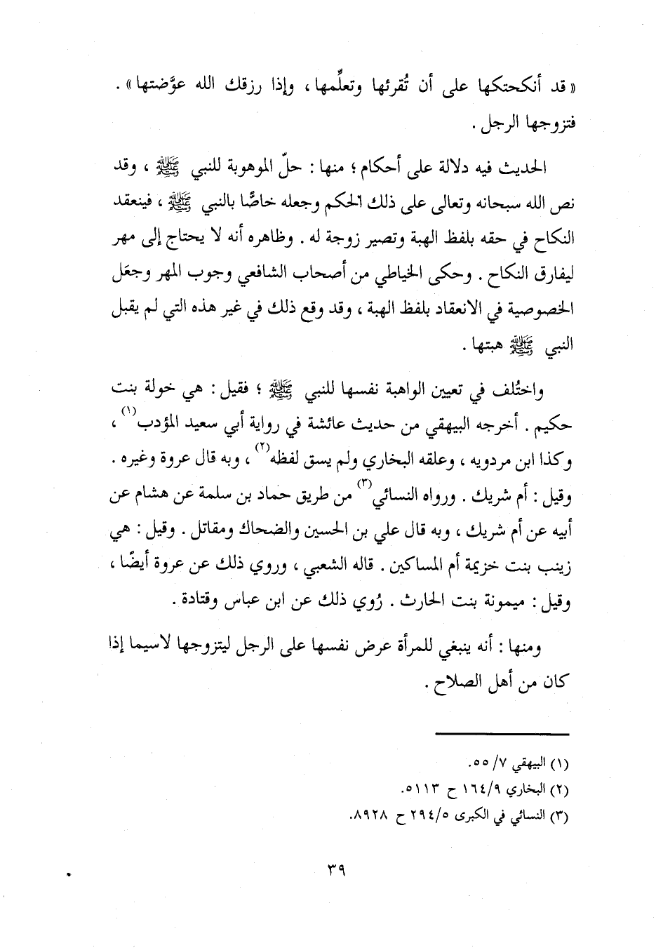 واختُلف في تعيين الواهبة نفسها للنبي - صلى الله عليه وسلم -؛ فقيل: هي خولة بنت حكيم. أخرجه البيهقي من حديث عائشة في رواية أبي سعيد المؤدب (¬1)، وكذا ابن مردويه، وعلقه البخاري ولم يسق لفظه (¬2)، وبه قال عروة وغيره. وقيل: أم شريك. ورواه النسائي (¬3) من طريق حماد بن سلمة عن هشام عن أبيه عن أم شريك، وبه قال علي بن الحسين والضحاك ومقاتل. وقيل: هي زينب بنت خزيمة أم المساكين. قاله الشعبي، وروي ذلك عن عروة أيضًا، وقيل: ميمونة بنت الحارث. رُوي ذلك عن ابن عباس وقتادة.