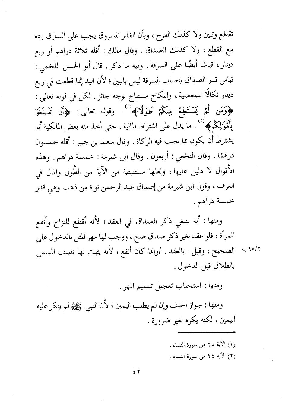 تقطع وتبين ولا كذلك الفرج، وبأن القدر المسروق يجب على السارق رده مع القطع، ولا كذلك الصداق. وقال مالك: أقله ثلاثة دراهم أو ربع دينار، قياسًا أيضًا على السرقة. وفيه ما ذكر. قال أبو الحسن اللخمي: قياس قدر الصداق بنصاب السرقة ليس بالبين؛ لأن اليد إنما قطعت في ربع دينار نكالًا للمعصية، والنكاح مستباح بوجه جائز. لكن في قوله تعالى: {وَمَنْ لَمْ يَسْتَطِعْ مِنْكُمْ طَوْلًا} (¬1). وقوله تعالى: {أَنْ تَبْتَغُوا بِأَمْوَالِكُمْ} (¬2). ما يدل على اشتراط المالية. حتى أخذ منه بعض المالكية أنه يشترط أن يكون مما يجب فيه الزكاة. وقال سعيد بن جبير: أقله خمسون درهمًا. وقال النخعي: أربعون. وقال ابن شبرمة: خمسة دراهم. وهذه الأقوال لا دليل عليها، ولعلها مستنبطة من الآية من الطَّول والمال في العرف، وقول ابن شبرمة من إصداق عبد الرحمن نواة من ذهب وهي قدر خمسة دراهم.