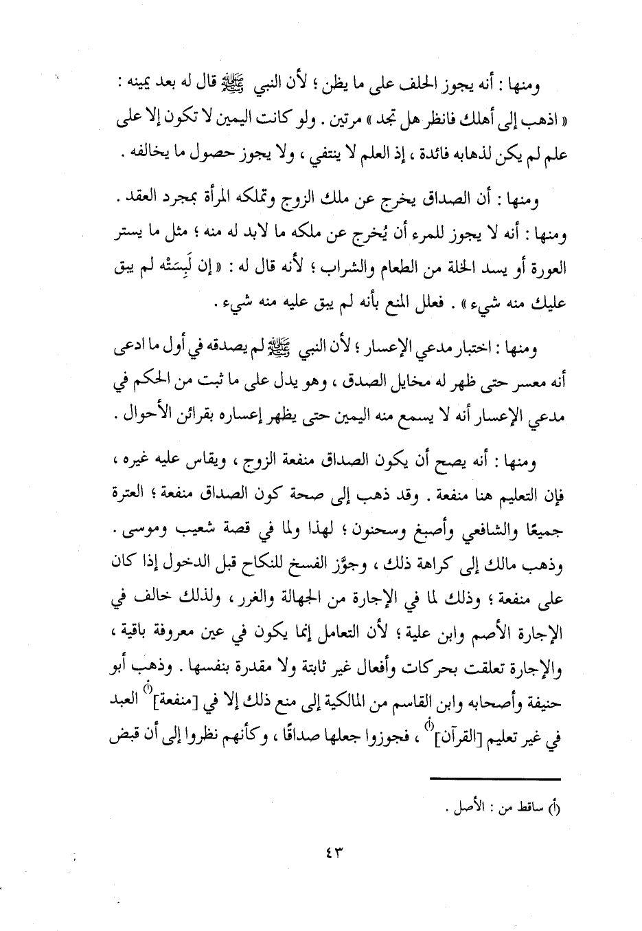 ومنها: أن الصداق يخرج عن ملك الزوج وتملكه المرأة بمجرد العقد. ومنها: أنه لا يجوز للمرء أن يُخرج عن ملكه ما لا بد له منه؛ مثل ما يستر العورة أو يسد الخلة من الطعام والشراب، لأنه قال له: "إن لَبِسَتْه لم يبق عليك منه شيء". فعلل المنع بأنه لم يبق عليه منه شيء.
