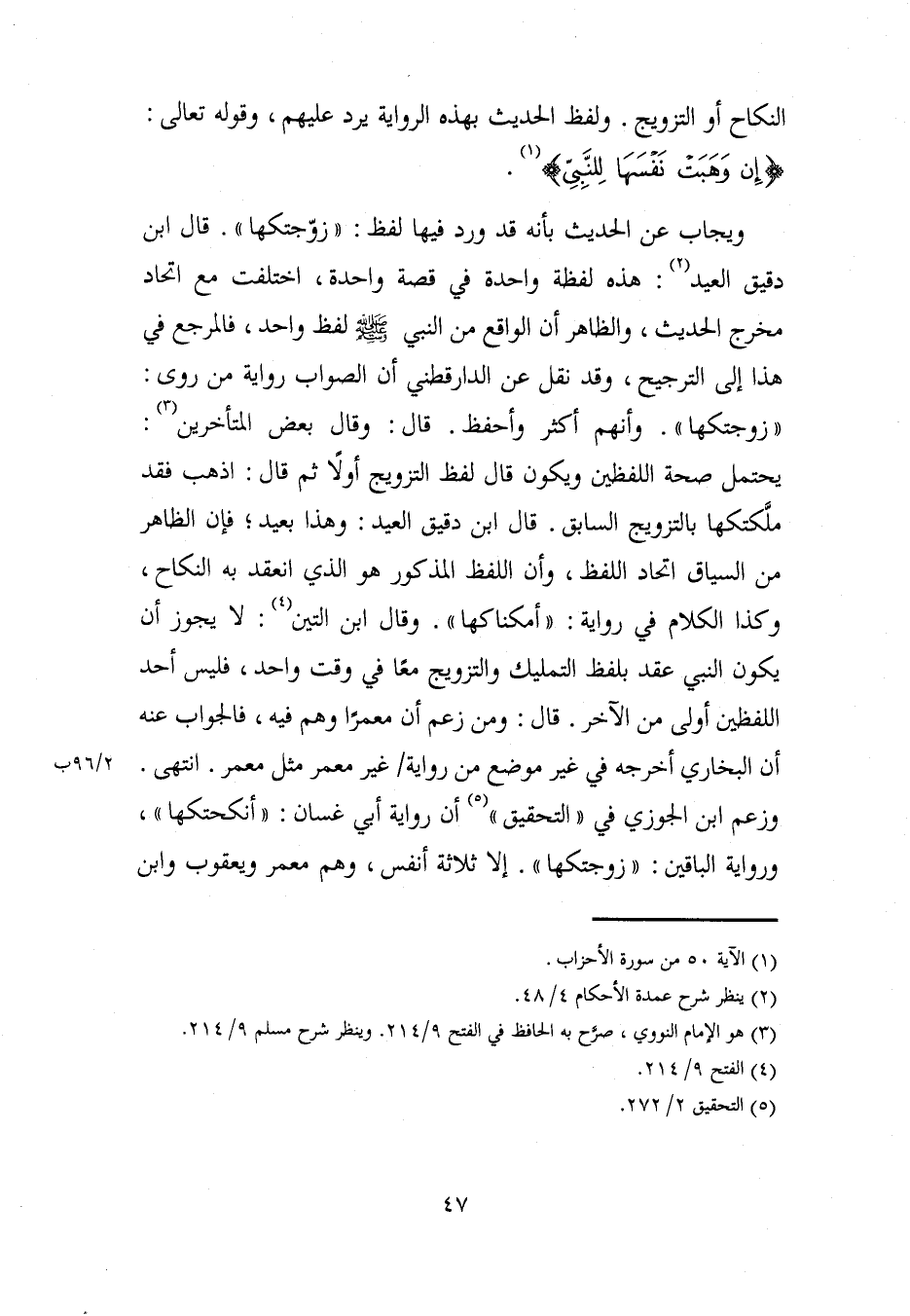 النكاح أو التزويج. ولفظ الحديث بهذه الرواية يرد عليهم، وقوله تعالى: {إِنْ وَهَبَتْ نَفْسَهَا لِلنَّبِيِّ} (¬1).