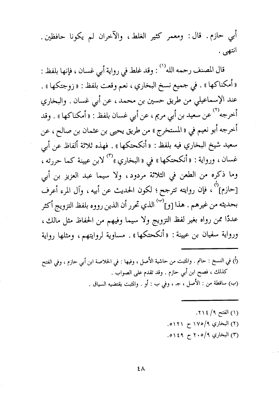 قال المصنف رحمه الله (¬1): وقد غلط في رواية أبي غسان، فإنها بلفظ: "أمكناكها". في جميع نسخ البخاري، نعم وقعت بلفظ: "زوجتكها". عند الإسماعيلي من طريق حسين بن محمد، عن أبي غسان. والبخاري أخرجه (¬2) عن سعيد بن أبي مريم، عن أبي غسان بلفظ: "أمكناكها". وقد أخرجه أبو نعيم في "المستخرج" من طريق يحيى بن عثمان بن صالح، عن سعيد شيخ البخاري فيه بلفظ: "أنكحتكها". فهذه ثلاثة ألفاظ عن أبي غسان، ورواية: "أنكحتكها" في "البخاري" (¬3) لابن عيينة كما حررته، وما ذكره من الطعن في الثلاثة مردود، ولا سيما عبد العزيز بن أبي [حازم] (أ)، فإن روايته تترجح؛ لكون الحديث عن أبيه، وآل المرء أعرف بحديثه من غيرهم. هذا [و] (5) الذي تحرر أن الذين رووه بلفظ التزويج أكثر عددًا ممن رواه بغير لفظ التزويج ولا سيما وفيهم من الحفاظ مثل مالك، ورواية سفيان بن عيينة: "أنكحتكها". مساوية لروايتهم، ومثلها رواية