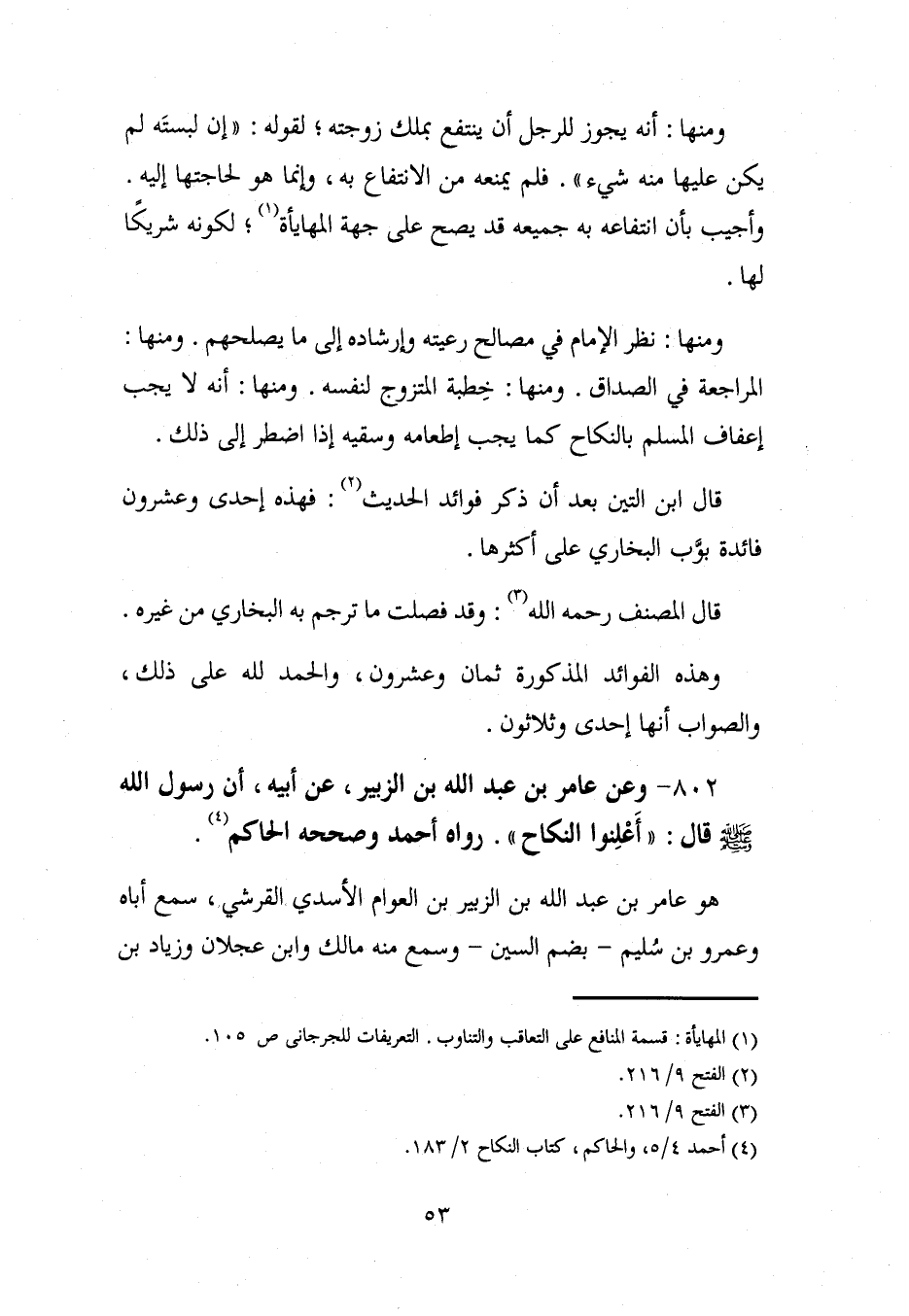ومنها: نظر الإمام في مصالح رعيته وإرشاده إلى ما يصلحهم. ومنها: المراجعة في الصداق. ومنها: خِطبة المتزوج لنفسه. ومنها: أنه لا يجب إعفاف المسلم بالنكاح كما يجب إطعامه وسقيه إذا اضطر إلى ذلك.