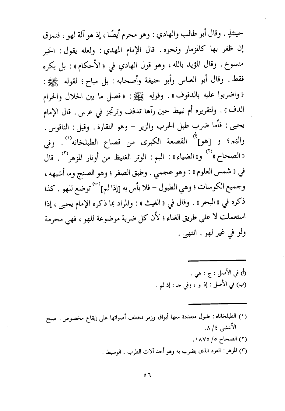 حينئذٍ. وقال أبو طالب والهادي: وهو محرم أيضًا، إذ هو آلة لهو، فتمزق إن ظفر بها كالمزمار ونحوه. قال الإمام المهدي: ولعلّه يقول: الخبر منسوخ. وقال المؤيد بالله، وهو قول الهادي في "الأحكام": بل يكره فقط. وقال أبو العباس وأبو حنيفة وأصحابه: بل مباح؛ لقوله - صلى الله عليه وسلم -: "واضربوا عليه بالدفوف". وقولِه - صلى الله عليه وسلم -: "فصل ما بين الحلال والحرام الدف". ولتقريره أم نبيط حين رآها تدفف وترتجز في عرس. قال الإمام يَحْيَى: فأمَّا ضرب طبل الحرب والزير -وهو النقارة. وقيل: الناقوس. والبَم؛ و [هو] (أ) القصعة الكبرى من قصاع الطبلخانه (¬1). وفي "الصحاح" (¬2) و"الضياء": البم: الوتر الغليظ من أوتار المزهر (¬3). قال في "شمس العلوم": وهو عجمي. وطبق الصفر؛ وهو الصنج وما أشبهه، وجميع الكوسات؛ وهي الطبول- فلا بأس به [إذا لم] (ب) توضع للهو. كذا ذكره في "البحر". وقال في "الغيث": والمراد بما ذكره الإمام يَحْيَى، إذا استعملت لا على طريق الغناء؛ لأنَّ كل ضربة موضوعة للهو، فهي محرمة ولو في غير لهو. انتهى.