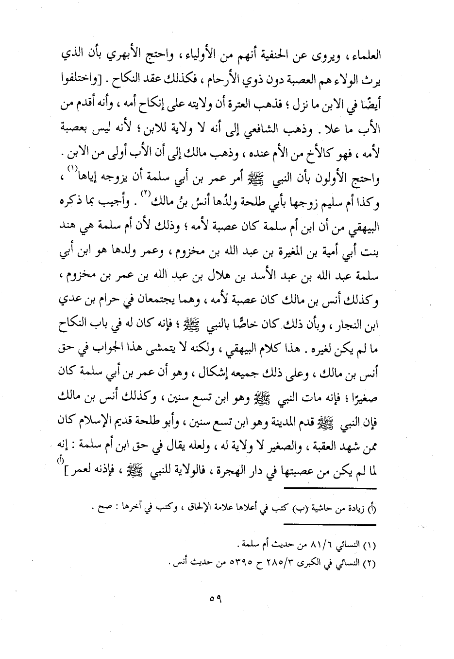 العلماء، ويروى عن الحنفية أنهم من الأولياء، واحتج الأبهري بأن الذي يرث الولاء هم العصبة دون ذوي الأرحام، فكذلك عقد النكاح. [واختلفوا أيضًا في الابن ما نزل؛ فذهب العترة أن ولايته على إنكاح أمه، وأنه أقدم من الأب ما علا. وذهب الشَّافعي إلى أنَّه لا ولاية للابن؛ لأنَّه ليس بعصبة لأمه، فهو كالأخ من الأم عنده، وذهب مالك إلى أن الأب أولى من الابن. واحتج الأولون بأن النَّبيَّ - صلى الله عليه وسلم - أمر عمر بن أبي سلمة أن يزوجه إياها (¬1)، وكذا أم سليم زوجها بأبي طلحة ولدُها أنسُ بنُ مالك (¬2). وأجيب بما ذكره البيهقي من أن ابن أم سلمة كان عصبة لأمه؛ وذلك لأنَّ أم سلمة هي هند بنت أبي أميَّة بن المغيرة بن عبد الله بن مخزوم، وعمر ولدها هو ابن أبي سلمة عبد الله بن عبد الأسد بن هلال بن عبد الله بن عمر بن مخزوم، وكذلك أنس بن مالك كان عصبة لأمه، وهما يجتمعان في حرام بن عدي بن النجار، وبأن ذلك كان خاصًّا بالنبي - صَلَّى الله عليه وسلم -؛ فإنَّه كان له في باب النكاح ما لم يكن لغيره. هذا كلام البيهقي، ولكنه لا يتمشى هذا الجواب في حق أنس بن مالك، وعلى ذلك جميعه إشكال، وهو أن عمر بن أبي سلمة كان صغيرًا؛ فإنَّه مات النَّبيُّ - صلى الله عليه وسلم - وهو ابن تسع سنين، وكذلك أنس بن مالك فإن النَّبيَّ - صَلَّى الله عليه وسلم - قدم المدينة وهو ابن تسع سنين، وأبو طلحة قديم الإسلام كان ممن شهد العقبة، والصغير لا ولاية له، ولعلّه يقال في حق ابن أم سلمة: إنه لما لم يكن من عصبتها في دار الهجرة، فالولاية للنبي - صلى الله عليه وسلم -، فإذنه لعمر] (أ)