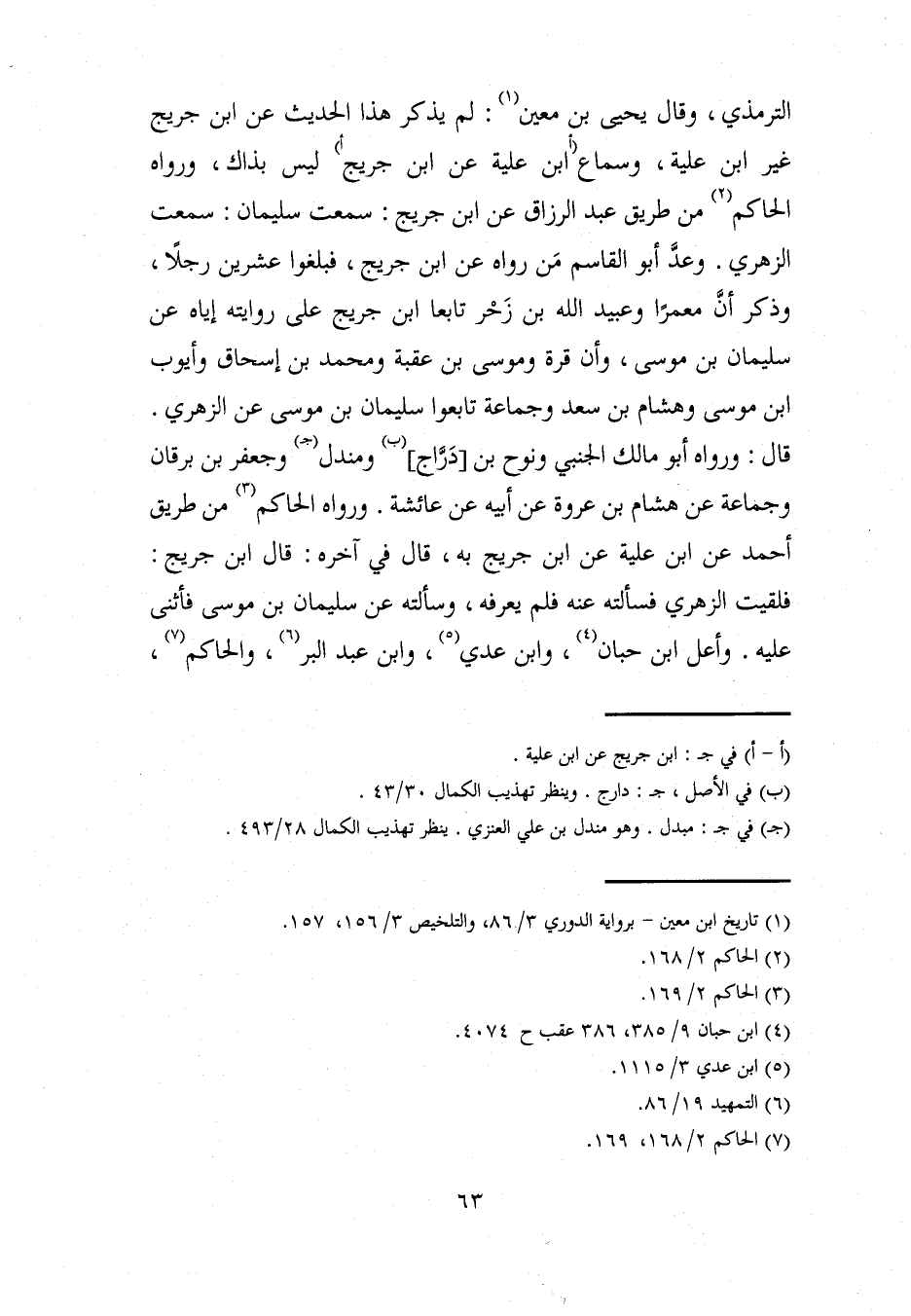 التِّرمذيُّ، وقال يَحْيَى بن معين (¬1): لم يذكر هذا الحديث عن ابن جريج غير ابن علية، وسماع (أابن علية عن ابن جريج أ) ليس بذاك، ورواه الحاكم (¬2) من طريق عبد الرَّزاق عن ابن جريج: سمعت سليمان: سمعت الزُّهريّ. وعدَّ أبو القاسم مَن رواه عن ابن جريج، فبلغوا عشرين رجلًا، وذكر أنَّ معمرًا وعبيد الله بن زَحْر تابعا ابن جريج على روايته إياه عن سليمان بن موسى، وأن قرة وموسى بن عقبة ومحمد بن إسحاق وأيوب بن موسى وهشام بن سعد وجماعة تابعوا سليمان بن موسى عن الزُّهريّ. قال: ورواه أبو مالك الجنبي ونوح بن [دَرَّاج] (ب) ومندل (جـ) وجعفر بن برقان وجماعة عن هشام بن عروة عن أبيه عن عائشة. ورواه الحاكم (¬3) من طريق أحمد عن ابن علية عن ابن جريج به، قال في آخره: قال ابن جريج: فلقيت الزُّهريّ فسألته عنه فلم يعرفه، وسألته عن سليمان بن موسى فأثنى عليه. وأعل ابن حبان (¬4)، وابن عدي (¬5)، وابن عبد البر (¬6)، والحاكم (¬7)،