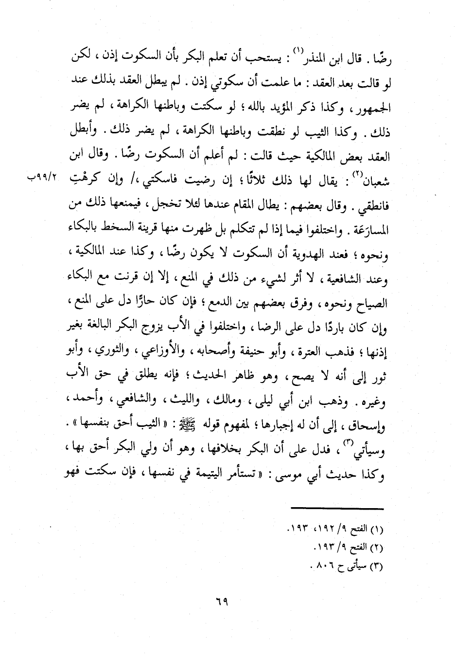 رضًا. قال ابن المنذر (¬1): يستحب أن تعلم البكر بأن السكوت إذن، لكن لو قالت بعد العقد: ما علمت أن سكوتي إذن. لم يبطل العقد بذلك عند الجمهور، وكذا ذكر المؤيد بالله؛ لو سكتت وباطنها الكراهة، لم يضر ذلك. وكذا الثيب لو نطقت وباطنها الكراهة، لم يضر ذلك. وأبطل العقد بعض المالكية حيث قالت: لم أعلم أن السكوت رضًا. وقال ابن شعبان (¬2): يقال لها ذلك ثلاثًا، إن رضيت فاسكتي، وإن كرهْتِ فانطقي. وقال بعضهم: يطال المقام عندها لئلا تخجل، فيمنعها ذلك من المسارَعَة. واختلفوا فيما إذا لم تتكلم بل ظهرت منها قرينة السخط بالبكاء ونحوه، فعند الهدوية أن السكوت لا يكون رضًا، وكذا عند المالكية، وعند الشَّافعية، لا أثر لشيء من ذلك في المنع، إلَّا إن قرنت مع البكاء الصياح ونحوه، وفرق بعضهم بين الدمع، فإن كان حارًّا دل على المنع، وإن كان باردًا دل على الرضا، واختلفوا في الأب يزوج البكر البالغة بغير إذنها؛ فذهب العترة، وأبو حنيفة وأصحابه، والأوزاعي، والثوري، وأبو ثور إلى أنَّه لا يصح، وهو ظاهر الحديث، فإنَّه يطلق في حق الأب وغيره. وذهب ابن أبي ليلى، ومالك، والليث، والشّافعيّ، وأحمد، وإسحاق، إلى أن له إجبارها؛ لمفهوم قوله - صلى الله عليه وسلم -: "الثيب أحق بنفسها". وسيأتي (¬3)، فدل على أن البكر بخلافها، وهو أن ولي البكر أحق بها، وكذا حديث أبي موسى: "تستأمر اليتيمة في نفسها، فإن سكتت فهو