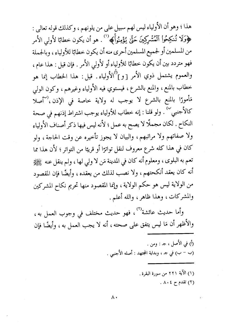 هذا، وهو أن الأولياء ليس لهم سبيل على من يلونهم، وكذلك قوله تعالى: {وَلَا تُنْكِحُوا الْمُشْرِكِينَ حَتَّى يُؤْمِنُوا} (¬1). هو أن يكون خطابًا لأولي الأمر من المسلمين أو لجميع المسلمين أحرى منه أن يكون خطابًا للأولياء، وبالجملة فهو متردد بين أن يكون خطابًا للأولياء أو لأولي الأمر. فإن قيل: هذا عام، والعموم يشتمل ذوي الأمر [و] (أ) الأولياء. قيل: هذا الخطاب إنَّما هو خطاب بالمنع، والمنع بالشرع، فيستوي فيه الأولياء وغيرهم، وكون الولي مَأمورًا بالمنع بالشرع لا يوجب له ولاية خاصة في الإذن، (ب أصلًا كالأجنبي ب). ولو قلنا: إنه خطاب للأولياء يوجب اشتراط إذنهم في صحة النكاح. لكان مجملًا لا يصح به عمل؛ لأنَّه ليس فيها ذكر أصناف الأولياء ولا صفاتهم ولا مراتبهم، والبيان لا يجوز تأخيره عن وقت الحاجة، ولو كان في هذا كله شرع معروف لنقل تواترًا أو قريبًا من التواتر؛ لأنَّ هذا ممَّا تعم به البلوى، ومعلوم أنَّه كان في المدينة مَن لا ولي لها، ولم ينقل عنه - صَلَّى الله عليه وسلم - أنَّه كان يعقد أنكحتهم، ولا نصب لذلك من يعقده، وأيضًا فإن المقصود من الولاية ليس هو حكم الولاية، وإنَّما المقصود منها تحريم نكاح المشركين والمشركات، وهذا ظاهر، والله أعلم.