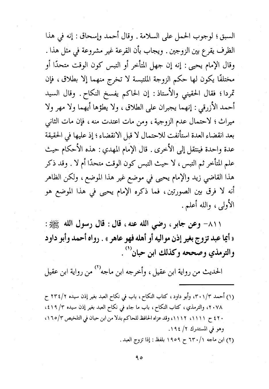 811 - وعن جابر، رضي الله عنه، قال: قال رسول الله - صلى الله عليه وسلم -: "أيما عبد تزوج بغير إذن مواليه أو أهله فهو طاهر". رواه أحمد وأبو داود والترمذي وصححه وكذلك ابن حبان (¬1).