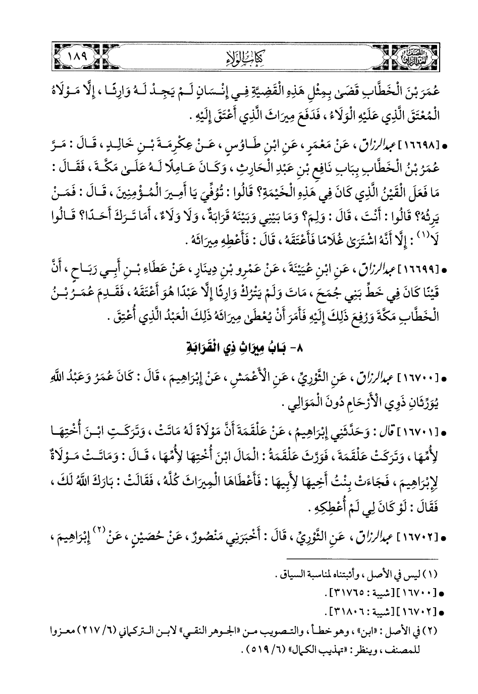 16698- عبد الرزاق، عَنْ مَعْمَرٍ، عَنِ ابْنِ طَاوُوسٍ، عَنْ عِكْرِمَةَ بْنِ خَالِدٍ، قَالَ: مَرَّ عُمَرُ بن الْخَطَّابِ بِبَابِ نَافِعِ بْنِ عَبدِ الْحَارِثِ، وَكَانَ عَامِلاً لَهُ عَلَى مَكَّةَ، فَقَالَ: مَا فَعَلَ الْقَيْنُ الَّذِي كَانَ فِي هَذِهِ الْخَيْمَةِ؟ قَالُوا: تُوُفِّيَ يَا أَمِيرَ المُؤْمِنِينَ، قَالَ: فَمَنْ يَرِثُهُ؟ قَالُوا: أَنْتَ، قَالَ: وَلِمَ؟ وَمَا بَيْنِي وَبَيْنَهُ قَرَابَةٌ، وَلاَ وَلاَءٌ، أَمَا تَرَكَ أَحَدًا؟ قَالُوا: لاَ، إِلاَّ أَنَّهُ اشْتَرَى غُلاَمًا فَأَعْتَقَهُ، قَالَ: فَأَعْطِهِ مِيرَاثَهُ.
