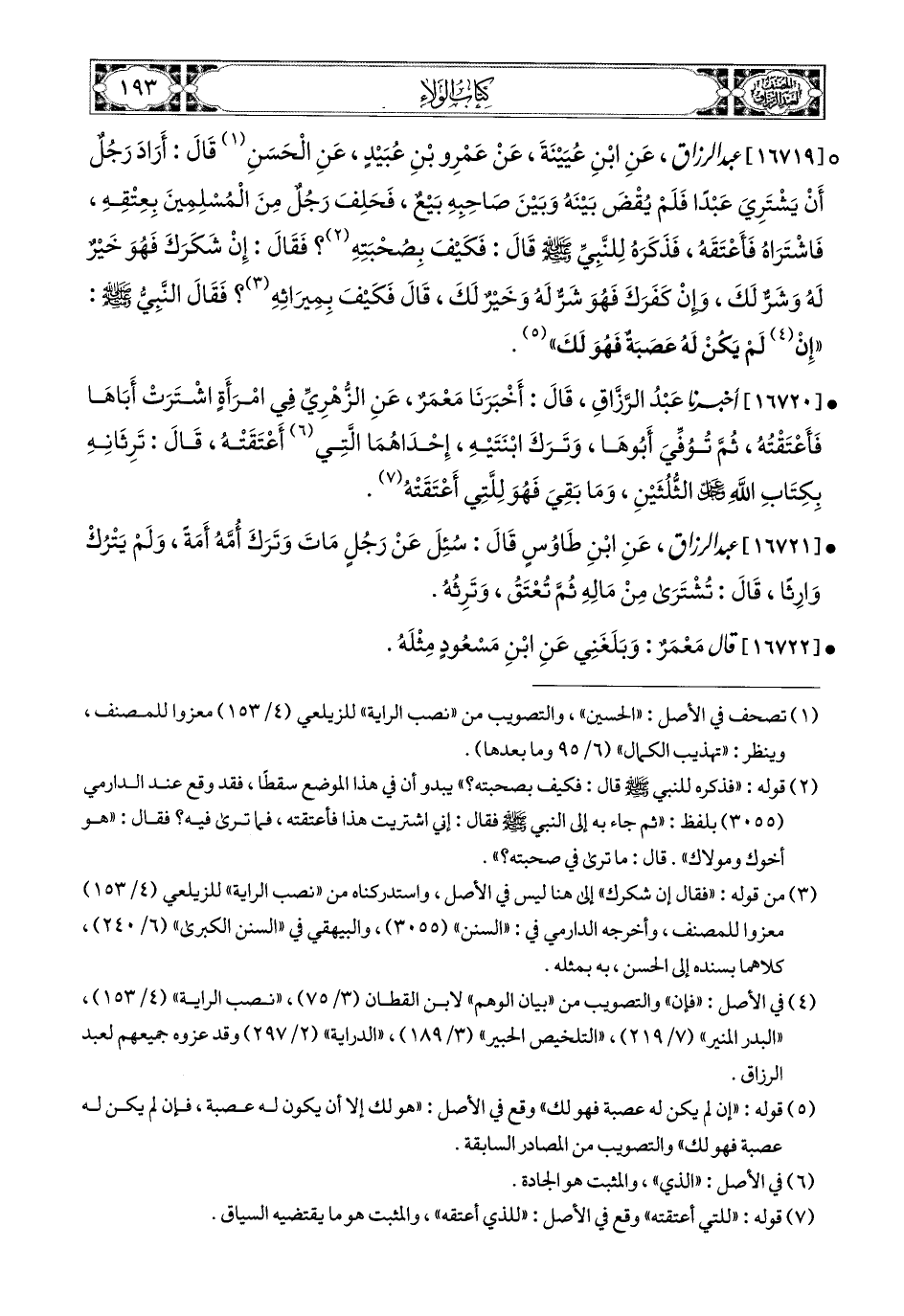 16719- عبد الرزاق، عَنِ ابْنِ عُيَيْنَةَ، عَنْ عَمْرِو بنِ عُبَيدٍ، عَنِ الْحَسَنِ قَالَ: أَرَادَ رَجُلٌ أَنْ يَشْتَرِيَ عَبدًا، فَلَمْ يُقْضَ بَيْنَهُ وَبَيْنَ صَاحِبِهِ بَيْعٌ، فَحَلِفَ رَجُلٌ مِنَ المُسْلِمِينَ بِعِتْقِهِ، فَاشْتَرَاهُ فَأَعْتَقَهُ، فَذَكَرَهُ لِلنَّبِيِّ صَلَّى اللهُ عَلَيْهِ وَسَلَّمَ، قَالَ: فَكَيْفَ بِصُحْبَتِهِ؟ فَقَالَ: إِنْ شَكَرَكَ فَهُوَ خَيْرٌ لَهُ وَشَرٌّ لَكَ، وَإِنْ كَفَرَكَ فَهُوَ شَرٌّ لَهُ وَخَيْرٌ لَكَ، قَالَ: فَكَيْفَ بِمِيرَاثِهِ؟ فَقَالَ النَّبِيُّ صَلَّى اللهُ عَلَيْهِ وَسَلَّمَ: إِنْ لَمْ يَكُنْ لَهُ عَصَبَةٌ فَهُوَ لَكَ.