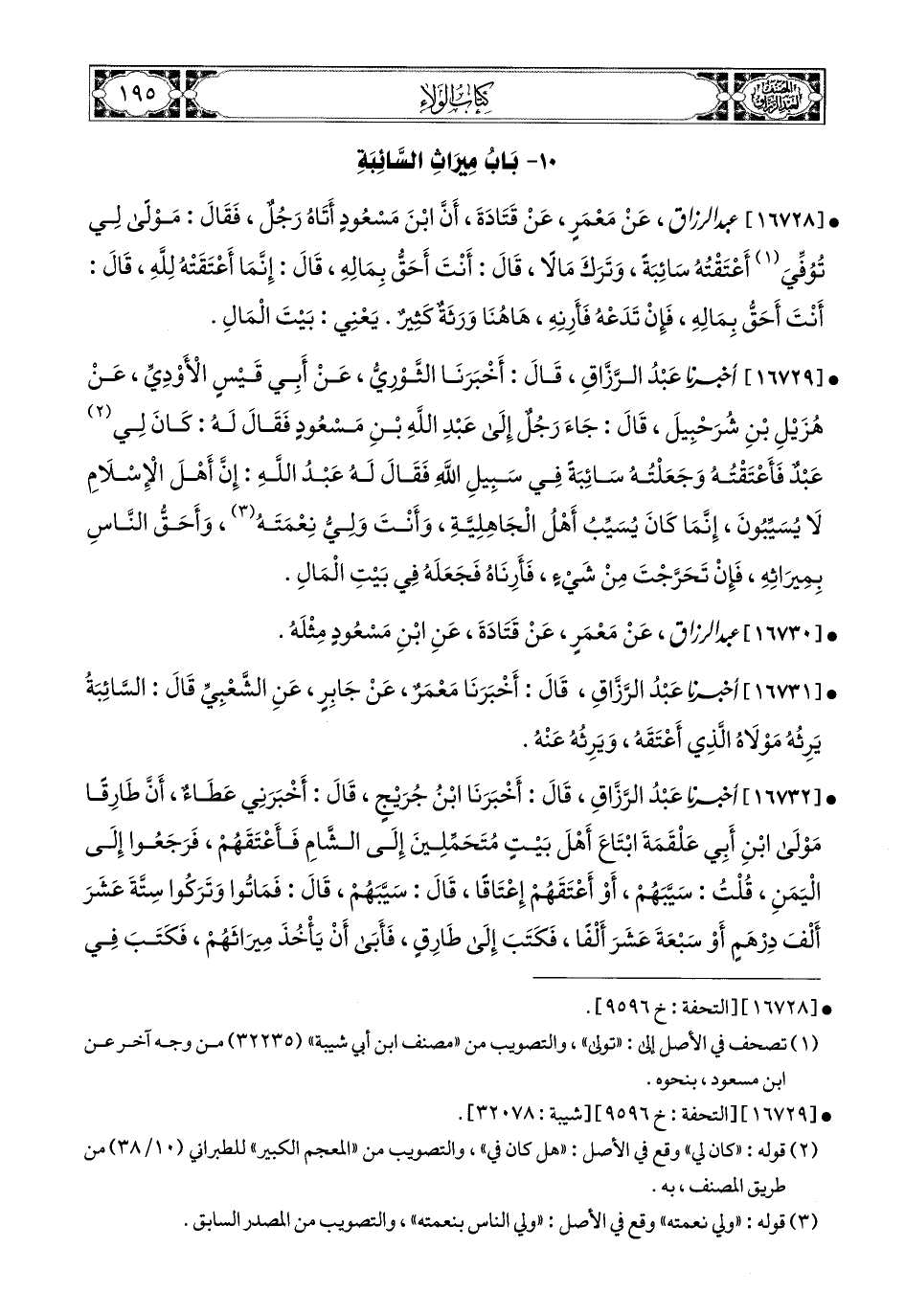 16728- عبد الرزاق، عَنْ مَعْمَرٍ، عَن قَتَادَةَ، أَنَّ ابْنَ مَسْعُودٍ أَتَاهُ رَجُلٌ فَقَالَ: مَوْلًى لِي تُوُفِّيَ، أَعْتَقْتُهُ سَائِبَةً، وَتَرَكَ مَالاً، قَالَ: أَنْتَ أَحَقُّ بِمَالِهِ، قَالَ: إِنَّمَا أَعْتَقْتُهُ للهِ، قَالَ: أَنْتَ أَحَقُّ بِمَالِهِ، فَإِنْ تَدَعْهُ فَأَرِنِهِ هَاهُنَا وَرَثَةٌ كَثِيرٌ، يَعْنِي بَيْتَ المَالِ.