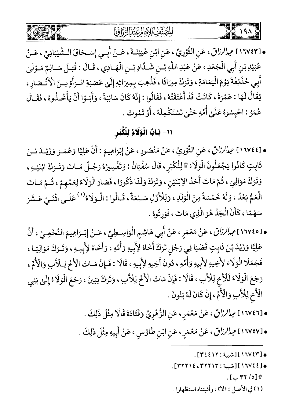 16744- عبد الرزاق، عَنِ الثَّورِيِّ، عَنْ مَنصُورٍ، عَن إِبرَاهِيمَ، أَنَّ عَلِيًّا، وَعُمَرَ، وَزَيْدَ بن ثَابِتٍ كَانُوا يَجْعَلُونَ الْوَلاَءَ لِلْكُبْرِ، قَالَ سُفْيَانُ: وَتَفْسِيرُهُ: رَجُلٌ مَاتَ وَتَرَكَ ابْنَيْهِ، وَتَرَكَ مَوَالِيَ، ثُمَّ مَاتَ أَحَدُ الاِبْنَيْنِ، وَتَرَكَ وَلَدًا ذُكُورًا، فَصَارَ الْوَلاَءُ لِعَمِّهِمْ، ثُمَّ مَاتَ الْعَمُّ بَعَدُ، وَلَهُ خَمْسَةٌ مِنَ الْوَلَدِ، وَلِلأَوَّلِ سَبْعَةٌ، قَالُوا: الْوَلاَءُ عَلَى اثْنَيْ عَشَرَ سَهْمًا كَأَنَّ الْجَدَّ هُوَ الَّذِي مَاتَ، فَوَرِثُوهُ.