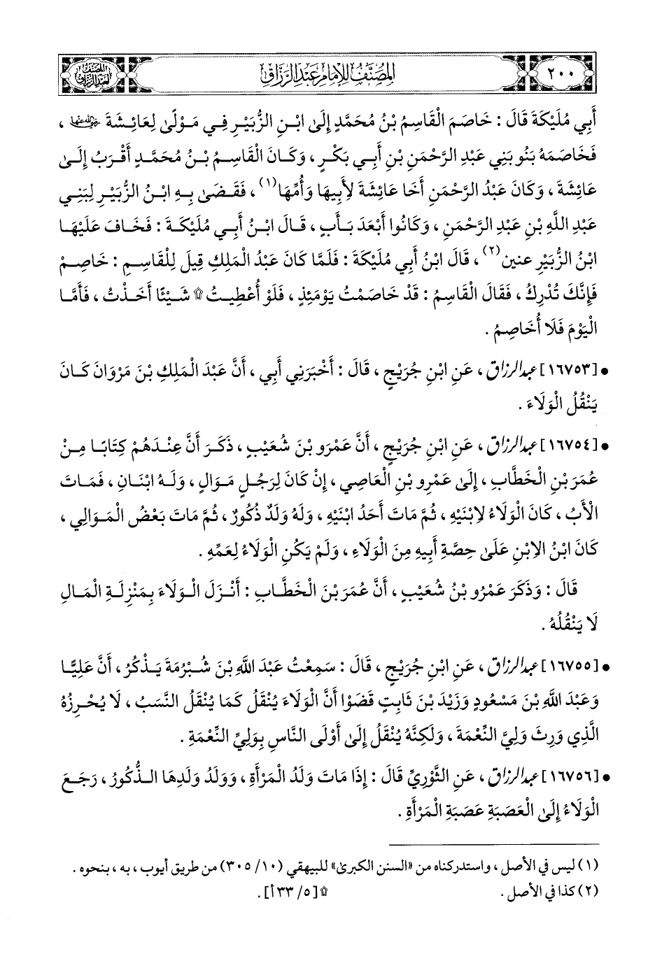 16754- عبد الرزاق، عَنِ ابْنِ جُرَيْجٍ، أَنَّ عَمْرَو بن شُعَيْبٍ ذَكَرَ، أَنَّ عِنْدَهُمْ كِتَابًا مِنْ عُمَرَ بْنِ الْخَطَّابِ إِلَى عَمْرِو بنِ الْعَاصِ: إِنْ كَانَ لِرَجُلٍ مَوَالٍ وَلَهُ ابْنَانِ فَمَاتَ الأَبُ كَانَ الْوَلاَءُ لاِبْنَيْهِ، ثُمَّ مَاتَ أَحَدُ ابْنَيْهِ وَلَهُ وَلَدٌ ذُكُورٌ، ثُمَّ مَاتَ بَعْضُ المَوَالِي كَانَ ابْنُ الاِبْنِ عَلَى حِصَّةِ أَبِيهِ مِنَ الْوَلاَءِ، وَلَمْ يَكُنِ الْوَلاَءُ لِعَمِّهِ، قَالَ: وَذَكَرَ عَمْرُو بن شُعَيْبٍ أَنَّ عُمَرَ بن الْخَطَّابِ أَنْزَلَ الْوَلاَءَ بِمَنْزِلَةِ المَالِ لاَ يَنْقُلُهُ.