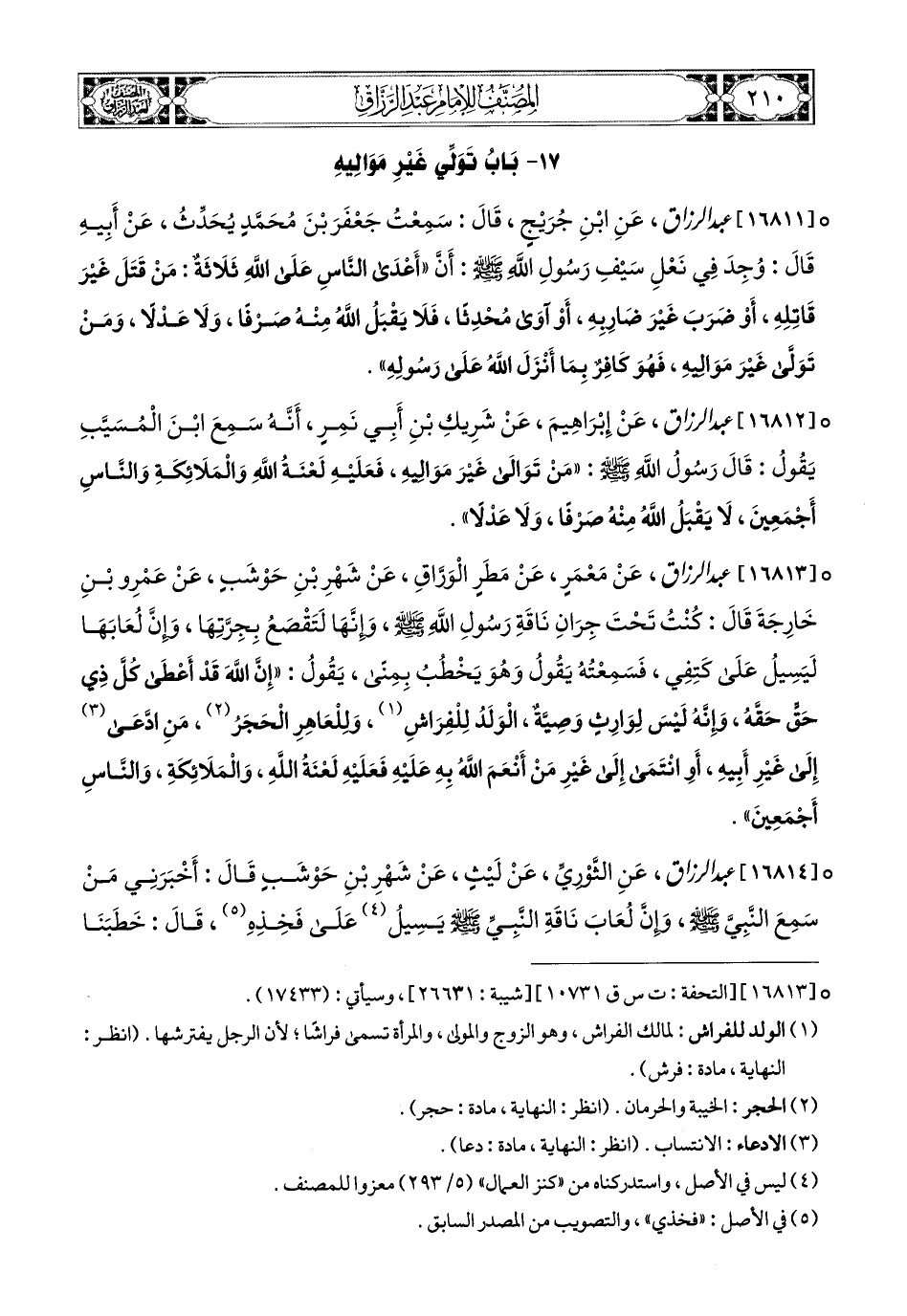 16812 - عبد الرزاق، عَن إِبرَاهِيمَ، عَن شَرِيكِ بْنِ أَبِي نَمِرٍ، أَنَّهُ سَمِعَ ابْنَ المُسَيَّبِ يَقُولُ: قَالَ رَسُولُ اللهِ صَلَّى اللهُ عَلَيْهِ وَسَلَّمَ: مَنْ تَوَالَى غَيْرَ مَوَالِيهِ، فَعَلَيْهِ لَعْنَةُ اللهِ وَالمَلاَئِكَةِ وَالنَّاسِ أَجْمَعِينَ، لاَ يَقْبَلُ اللهُ مِنْهُ صَرْفًا وَلاَ عَدْلاً.