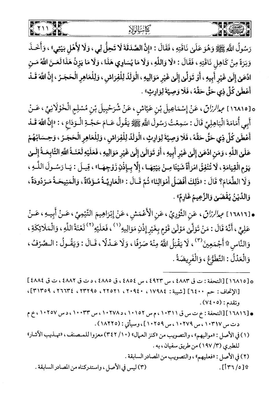 16816 - عبد الرزاق، عَنِ الثَّورِيِّ، عَنِ الأَعمَشِ، عَن إِبرَاهِيمَ التَّيْمِيِّ، عَنْ أَبِيهِ، عَنْ عَلِيٍّ أَنَّهُ قَالَ: مَنْ تَوَلَّى مَوْلَى قَوْمٍ بِغَيْرِ إِذْنِ مَوَالِيهِ، فَعَلَيْهِ لَعْنَةُ اللهِ وَالمَلاَئِكَةِ وَالنَّاسِ أَجْمَعِينَ، لاَ يَقْبَلُ اللهُ مِنْهُ صَرْفًا، وَلاَ عَدْلاً، قَالَ: وَيَقُولُ: الصَّرْفُ وَالْعَدْلُ: التَّطَوُّعُ وَالْفَرِيضَةُ.