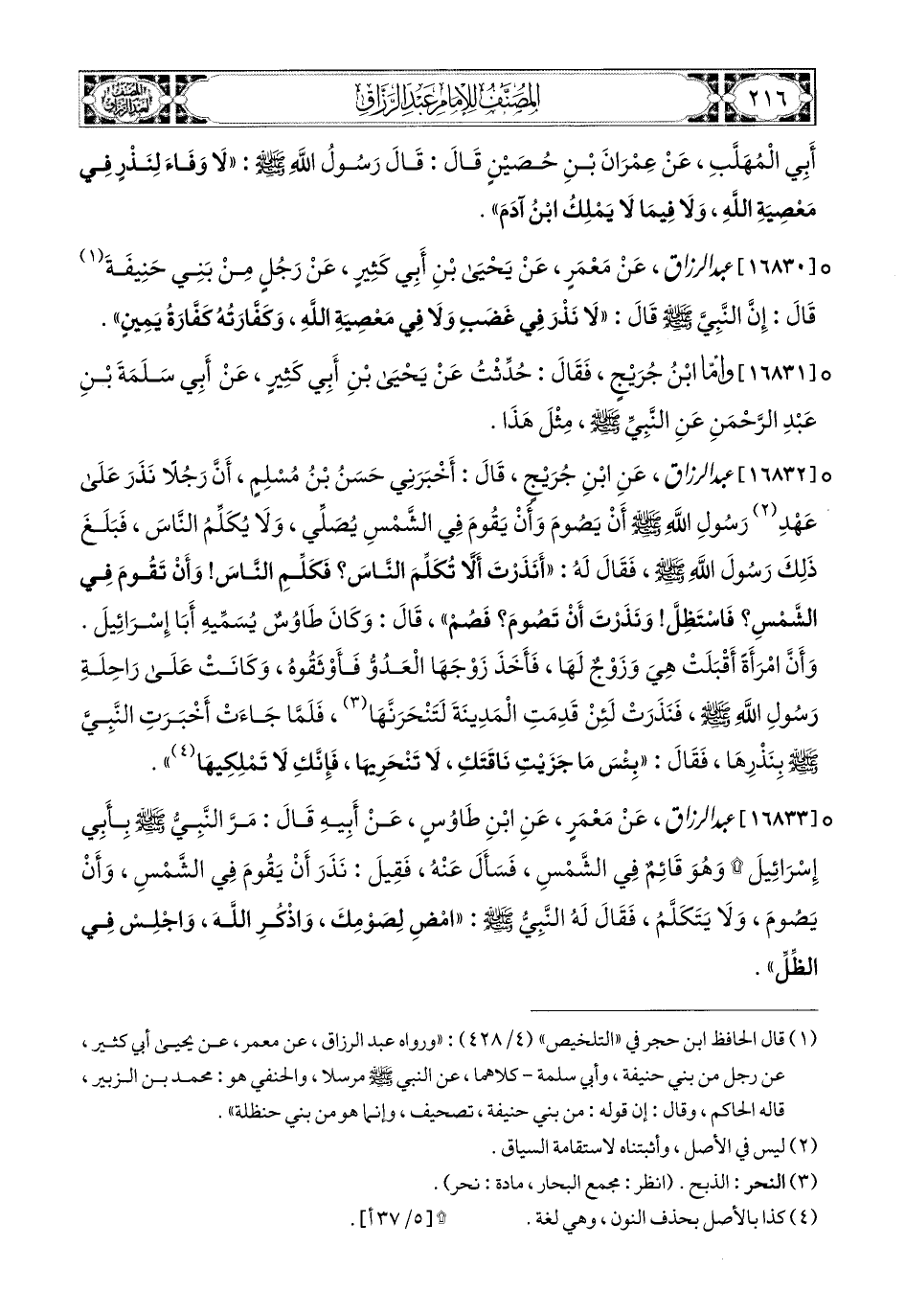 16832 - عبد الرزاق، عَنِ ابْنِ جُرَيْجٍ، قَالَ: أَخْبَرَنِي حَسَنُ بن مُسْلِمٍ، أَنَّ رَجُلاً نَذَرَ عَلَى عَهْدِ رَسُولِ اللهِ صَلَّى اللهُ عَلَيْهِ وَسَلَّمَ أَنْ يَصُومَ، وَأَنْ يَقُومَ فِي الشَّمْسِ يُصَلِّي، وَلاَ يُكَلِّمُ النَّاسَ، فَبَلَغَ ذَلِكَ رَسُولَ اللهِ صَلَّى اللهُ عَلَيْهِ وَسَلَّمَ، فَقَالَ لَهُ: أَنَذَرْتَ أَنْ لاَ تُكَلِّمَ النَّاسَ؟ فَكَلِّمِ النَّاسَ، وَأَنْ تَقُومَ فِي الشَّمْسِ؟ فَاسْتَظَلَّ، وَنَذَرْتَ أَنْ تَصُومَ؟ فَصُمْ، قَالَ: وَكَانَ طَاوُوسٌ يُسَمِّيهِ أَبَا إِسْرَائِيلَ، وَأَنَّ امْرَأَةً أَقْبَلَتْ هِيَ وَزَوْجٌ لَهَا، فَأَخَذَ زَوْجُهَا الْعَدُوَّ، فَأَوْثَقُوهُ، وَكَانَتْ عَلَى رَاحِلَةِ رَسُولِ اللهِ صَلَّى اللهُ عَلَيْهِ وَسَلَّمَ، فَنَذَرَتْ لَئِنْ قَدِمَتِ المَدِينَةَ لَتَنْحَرَنَّهَا، فَلَمَّا جَاءَتْ، أَخْبَرَتِ النَّبِيَّ صَلَّى اللهُ عَلَيْهِ وَسَلَّمَ بِنَذْرِهَا، فَقَالَ: بِئْسَ مَا جِزَيْتِ نَاقَتَكِ، لاَ تَنْحَرِيهَا، فَإِنَّكَ لاَ تَمْلِكِيهَا (1).